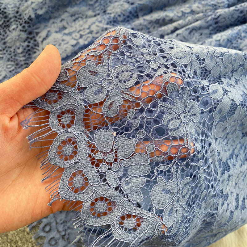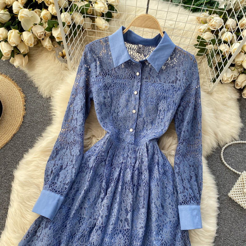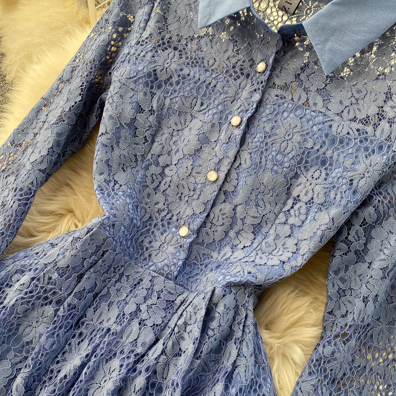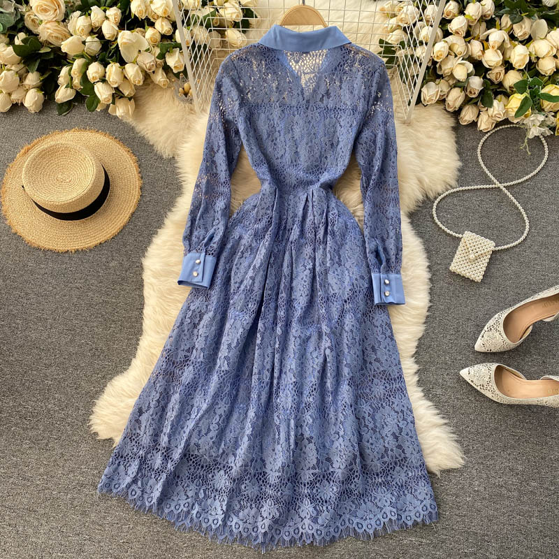 Vintage Hollow Out Lace Party Dress Women Elegant Turn-Down Collar Single Breasted Long Sleeve Blue Midi Vestidos Spring Winter
