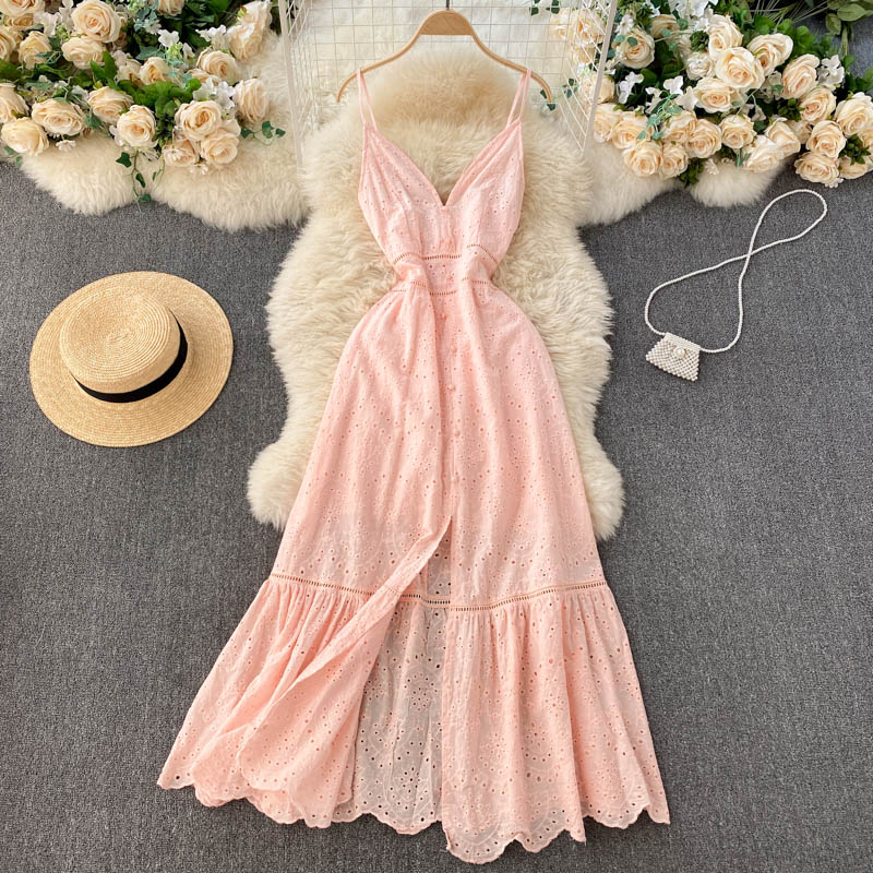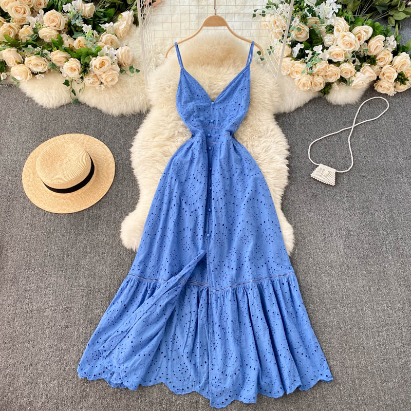 Bohemian Summer Beach Hollow Out Long Dress Sexy Women V-Neck High Waist Single Breasted A-Line Big Swing Vestidos New Robe