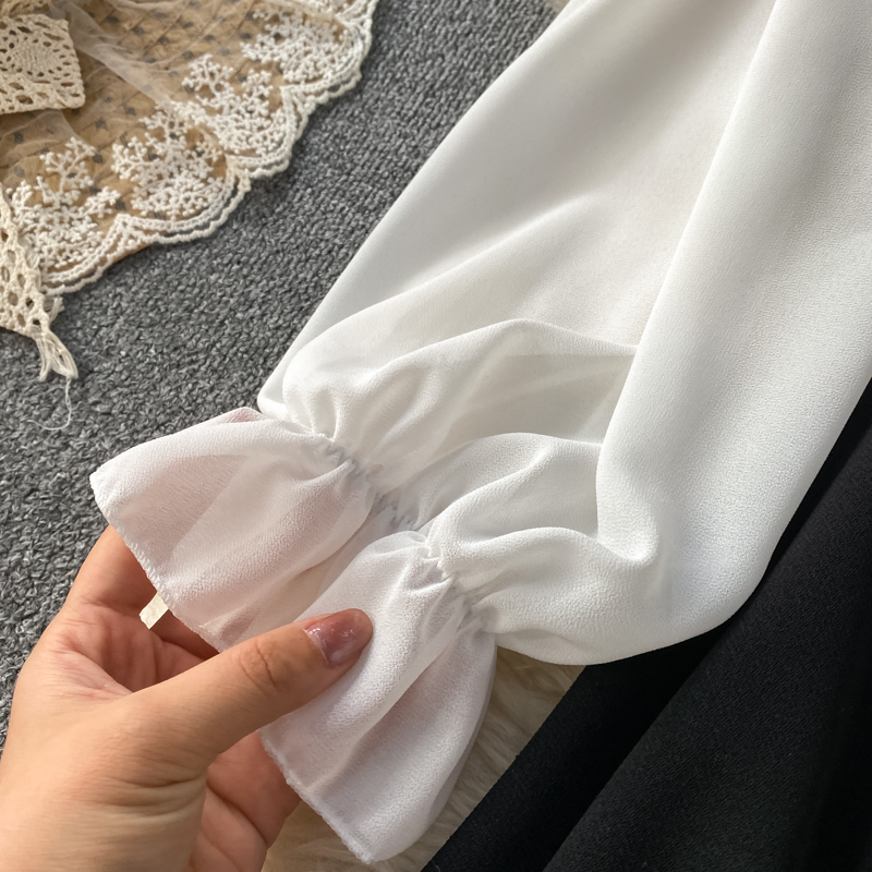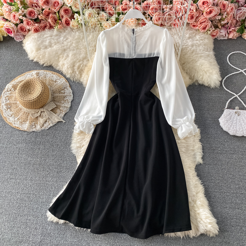 Spring Autumn Women Black Patchwork Mesh Dress Vintage New Fashion Flare Long Sleeve Ruffle Single Breasted Robe Female