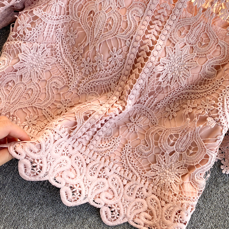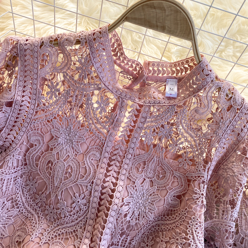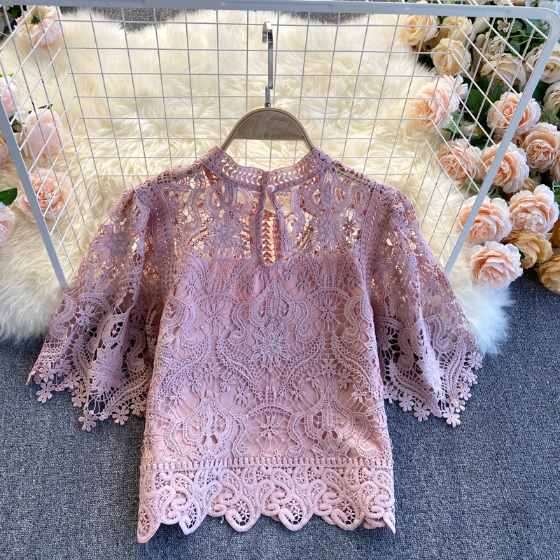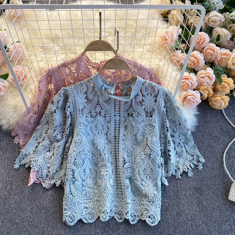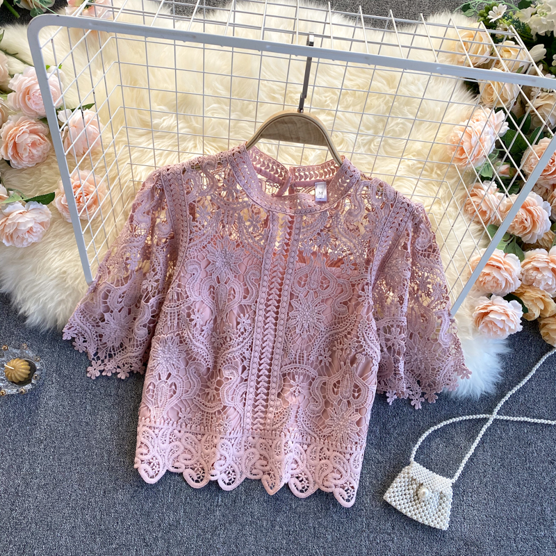 Summer Women Lace Hollow Out Shirts Vintage Round Neck Short Sleeve Slim Short Shirt Female Casual Blue/White/Pink Tops New