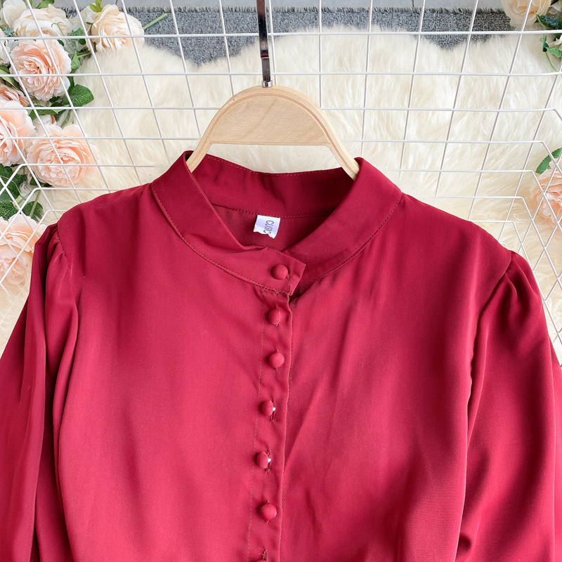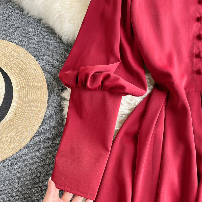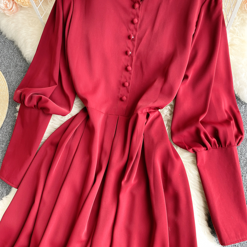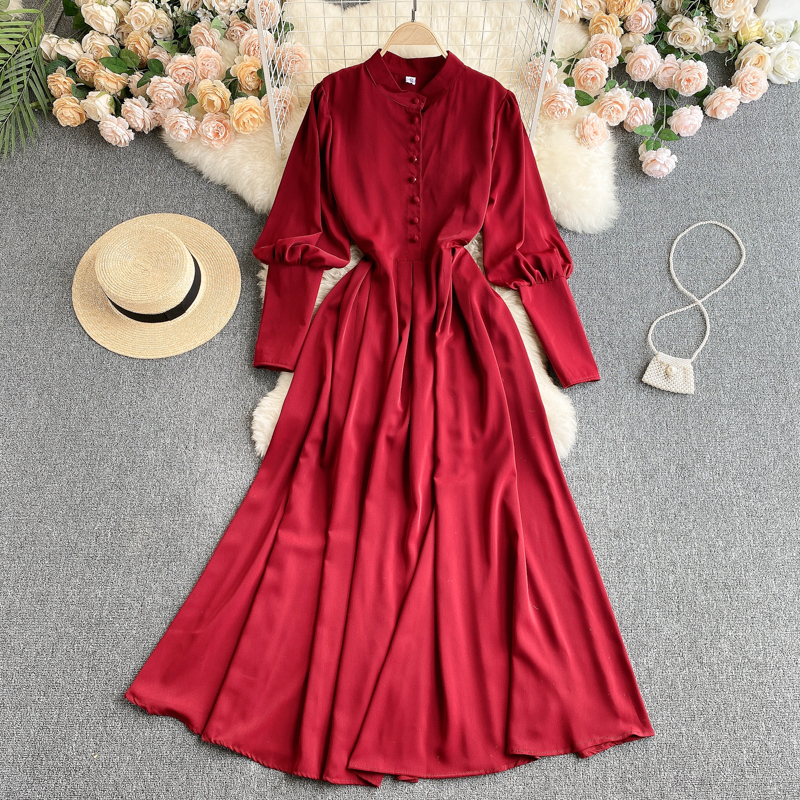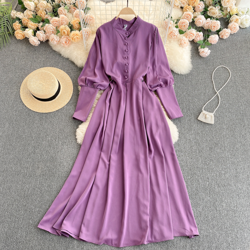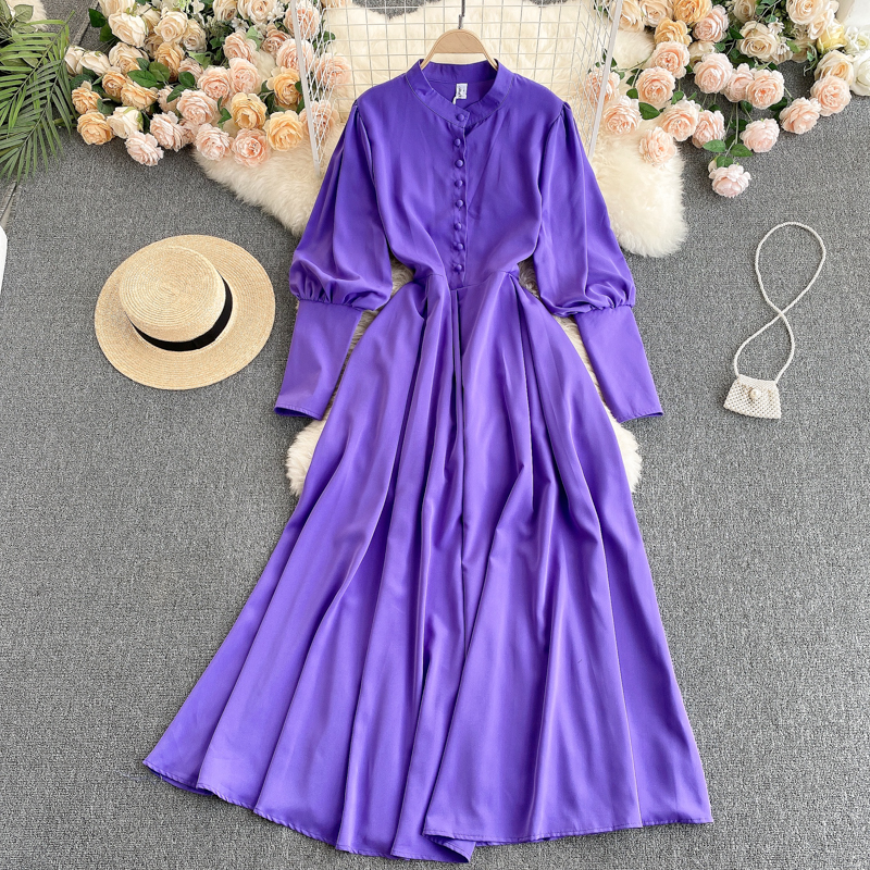 Vintage Single Breasted Long Dress Women Purple/Pink/Red A-Line Lantern Long Sleeve High Waist Casual Female Slim Robe New