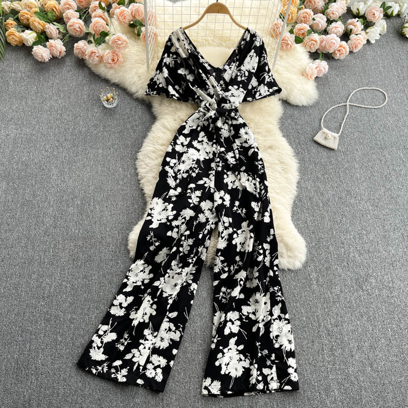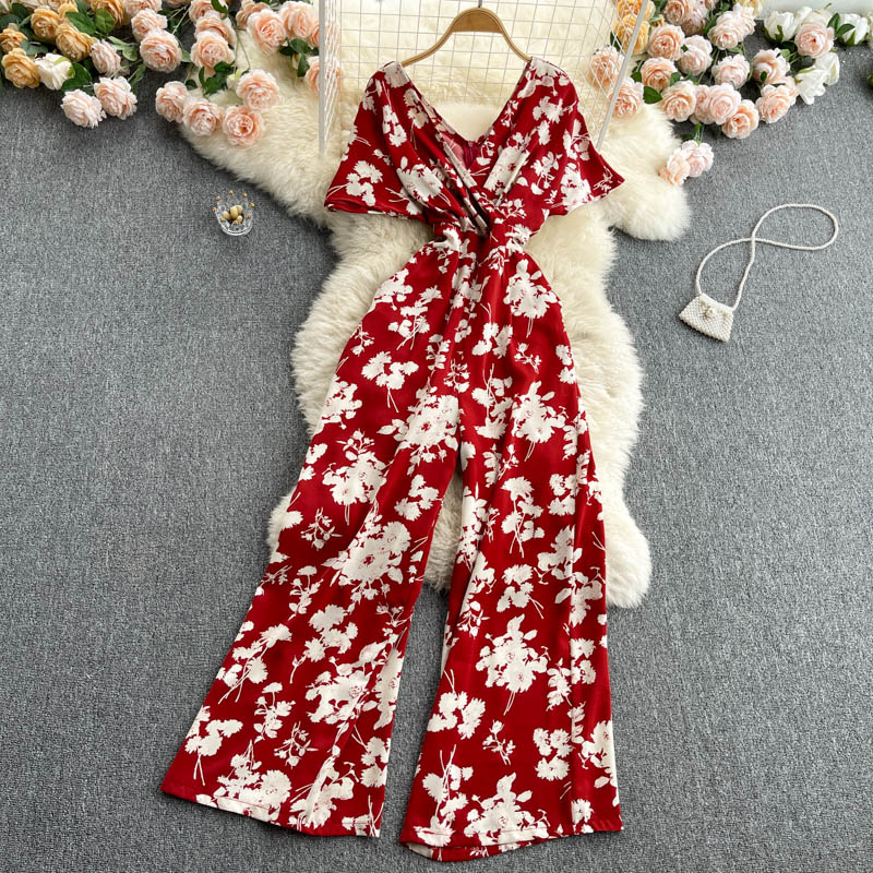 Summer Women Jumpsuits Sexy V-Neck Short Sleeve Wide Leg Romper Female Black/Red Loose High Waist Playsuits Beach Vacation