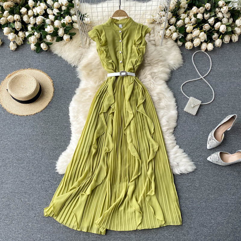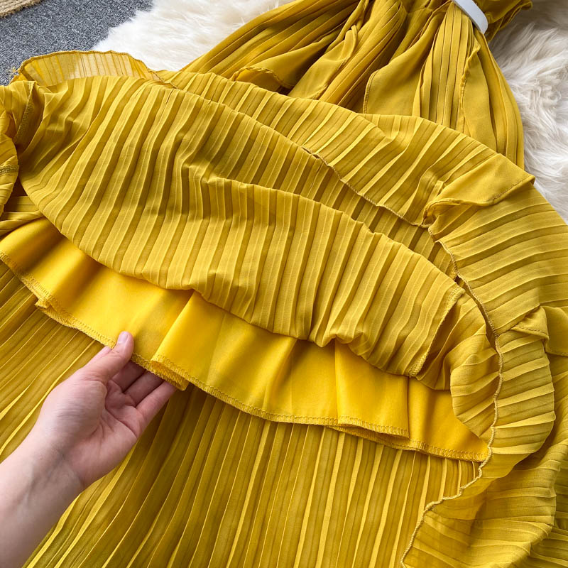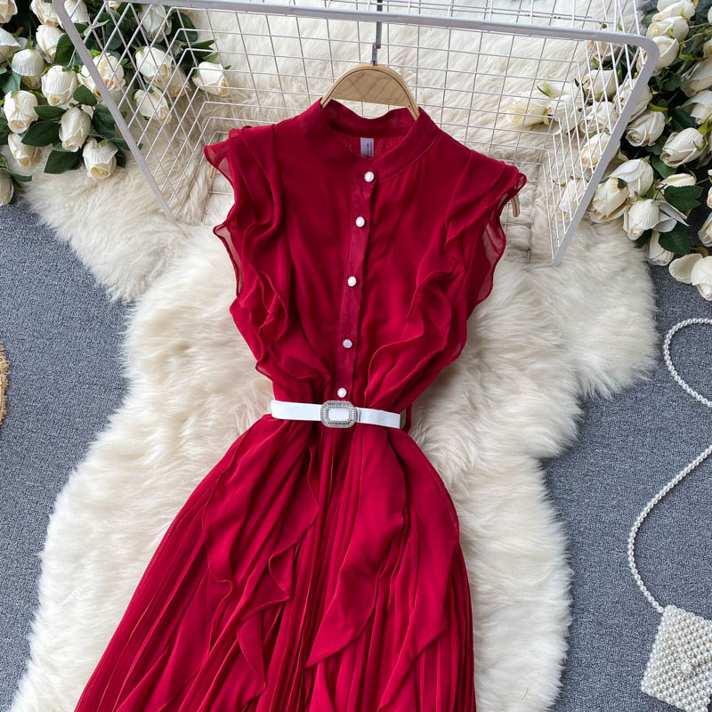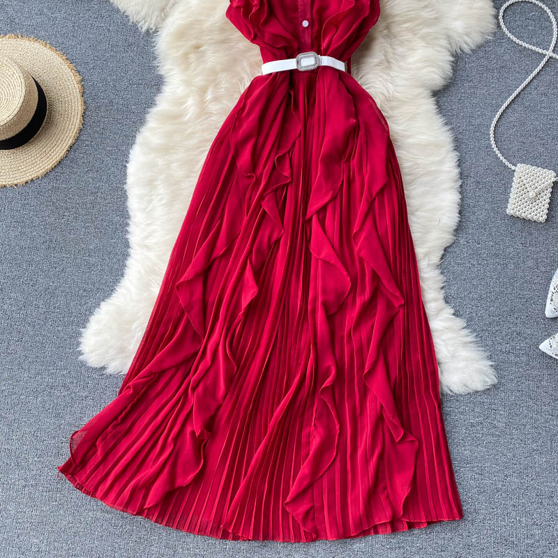Summer Beach Women Chiffon Pleated Long Dress Vintage Vacation Purple/Red Ruffle Single Breasted Draped Vestidos With Sashes New