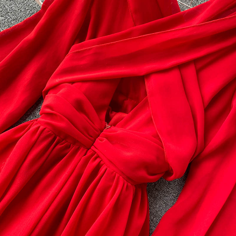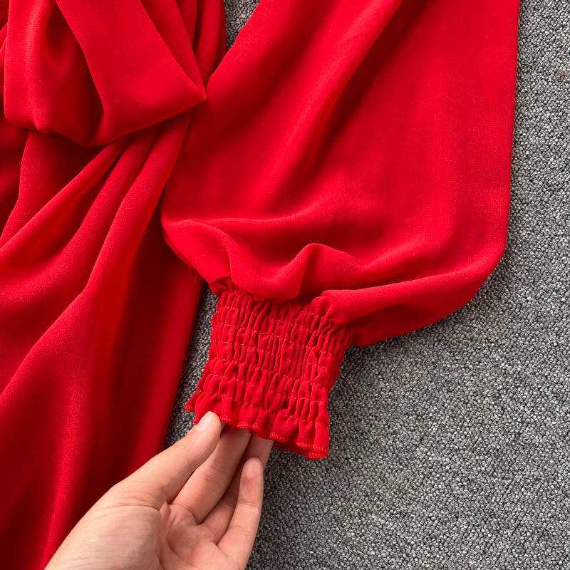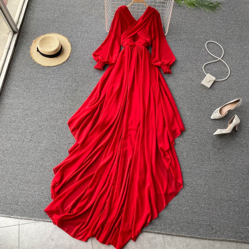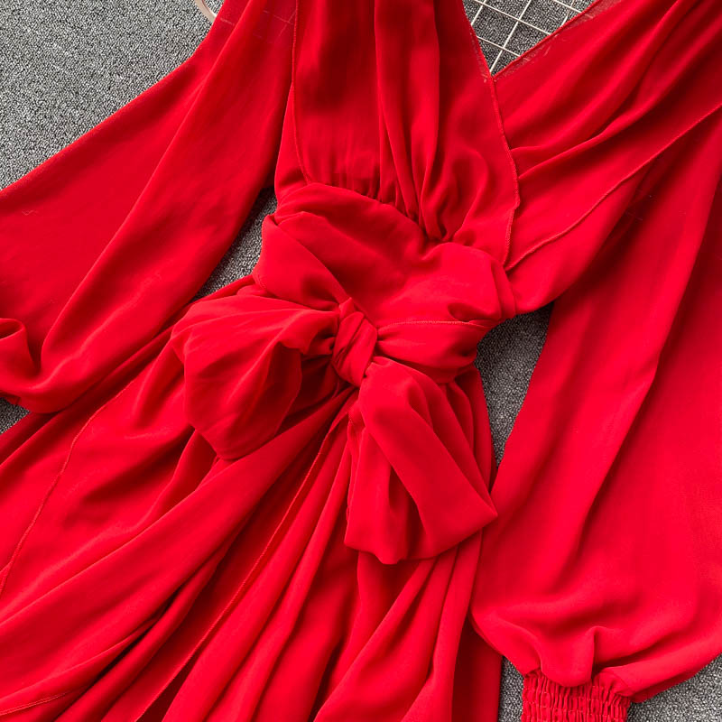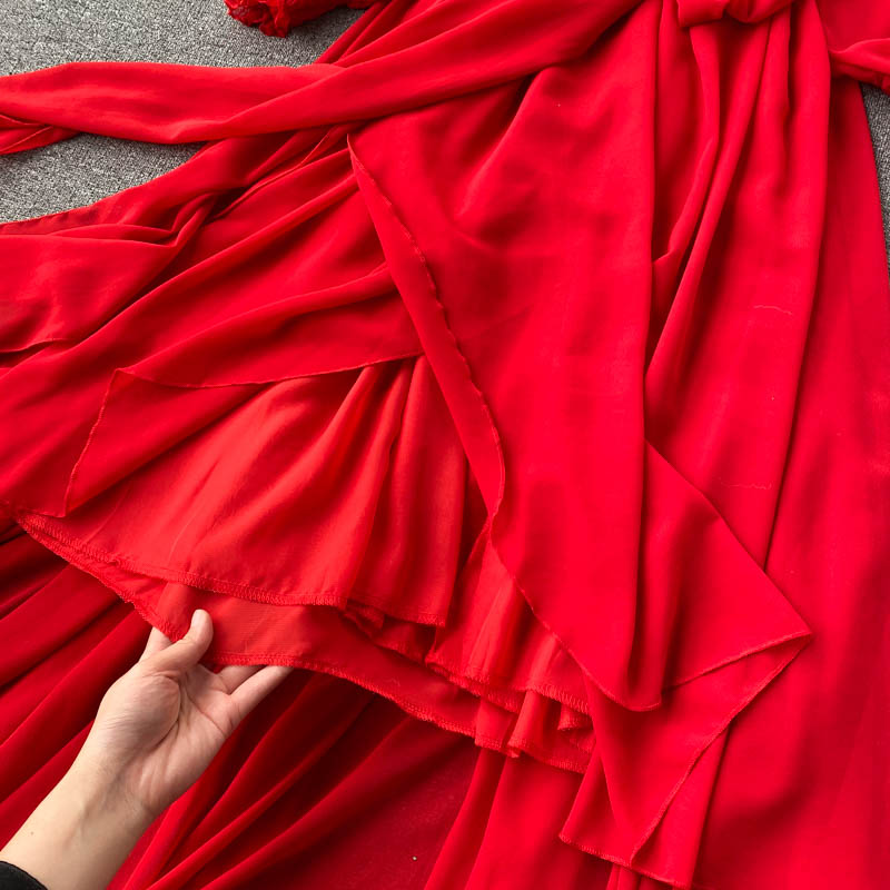 Women Red Irregular Long Dress Beach Vacation Party High Waist V-Neck Lantern Sleeve Bandage Vestidos Spring Autumn Fashion