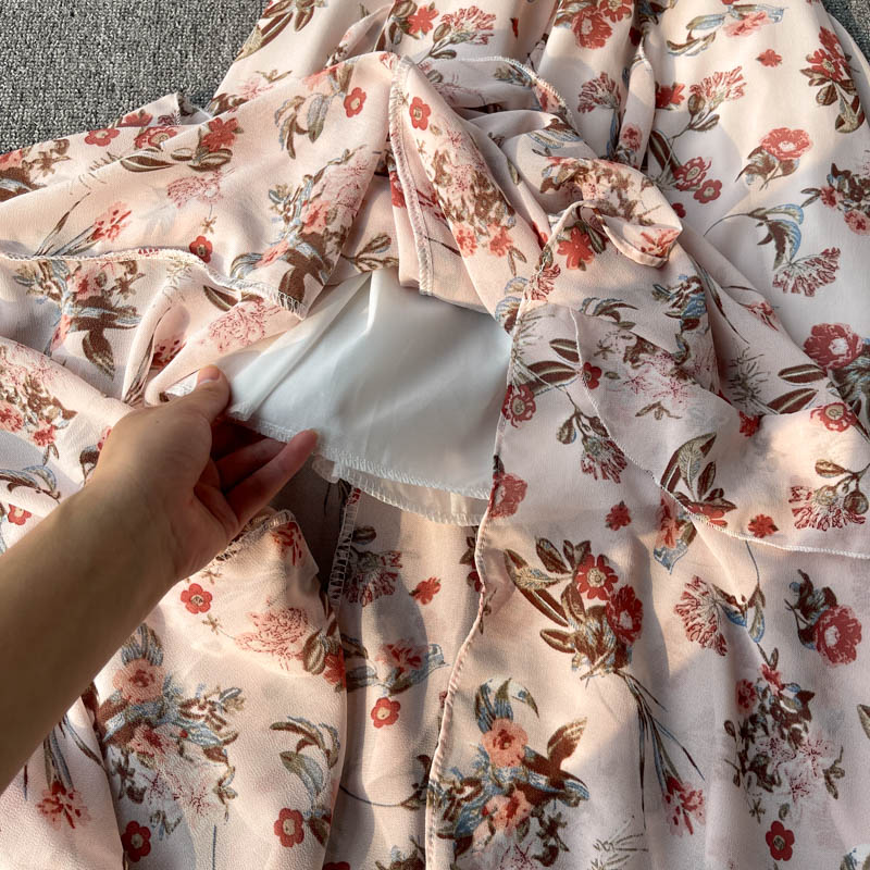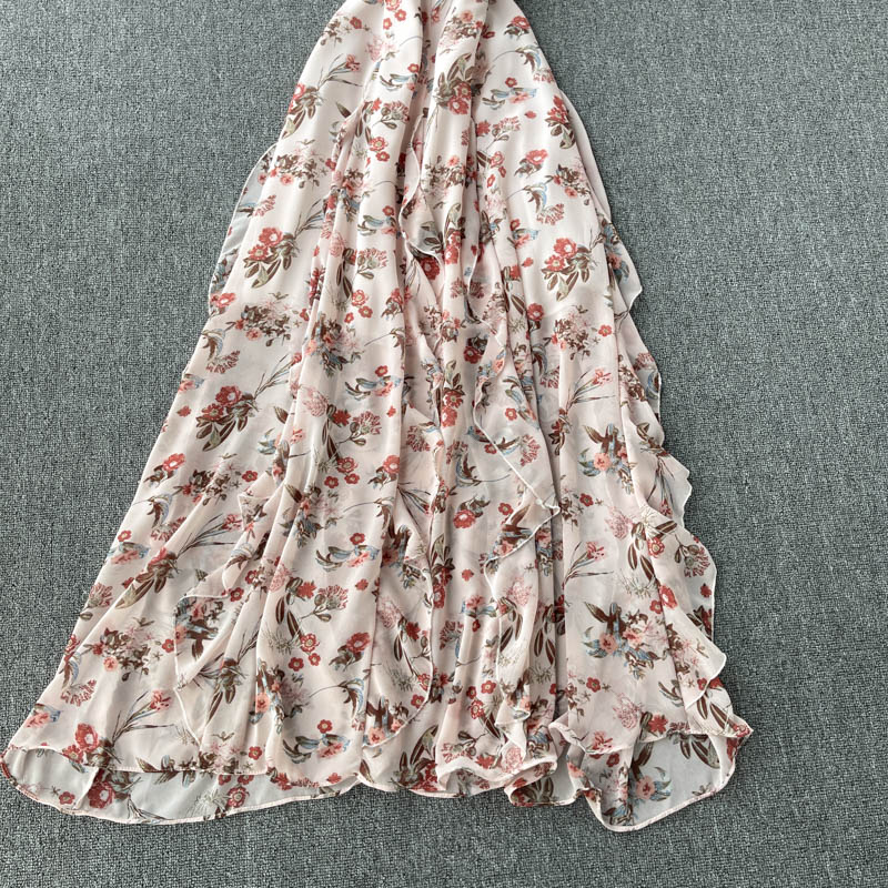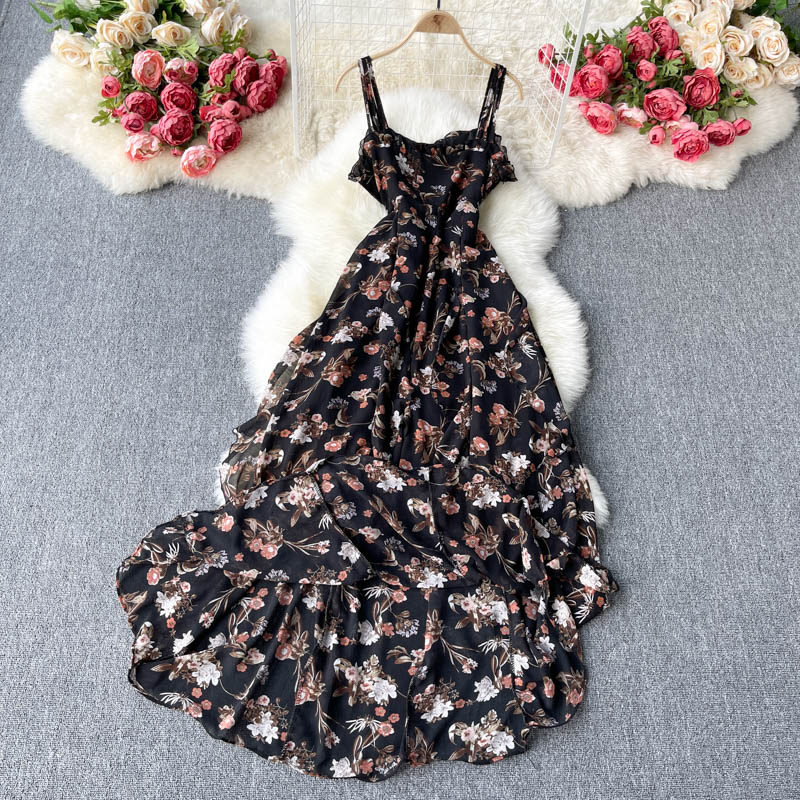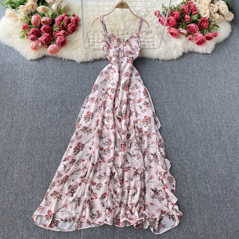 Summer Beach Floral Printed Ruffle Chiffon Long Dress Women Sexy Slash Neck Spaghetti Strap Vestidos Vacation Party Robe