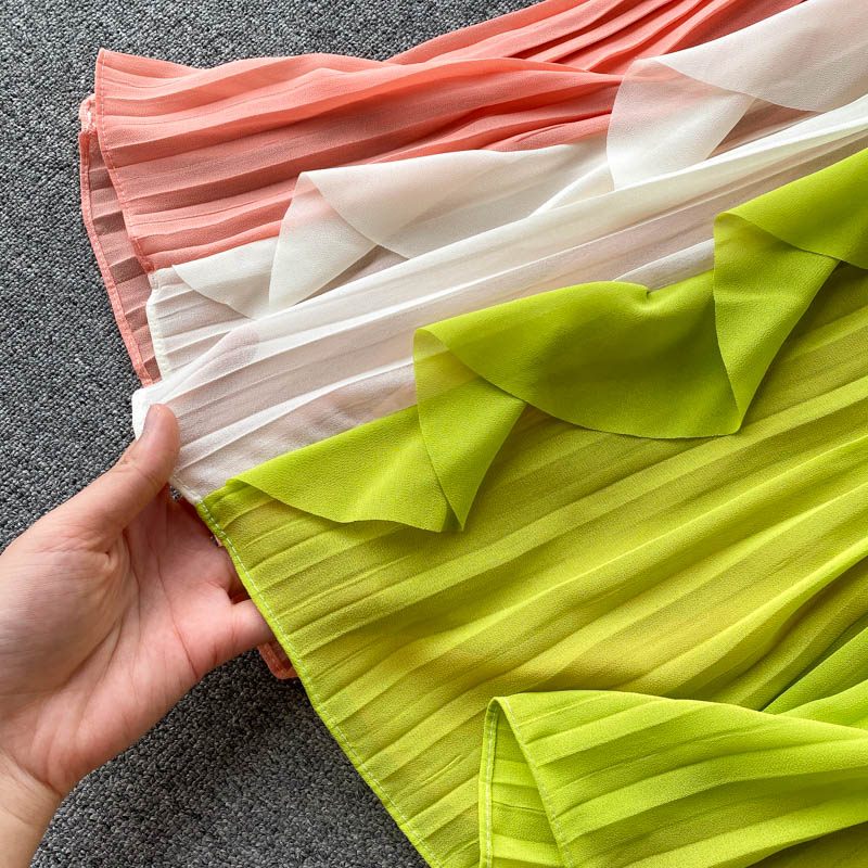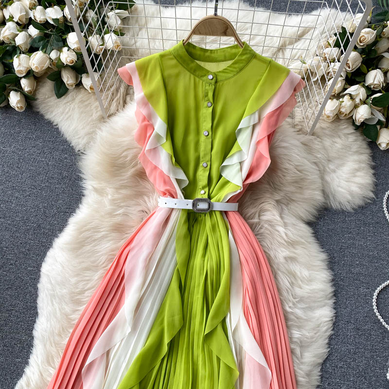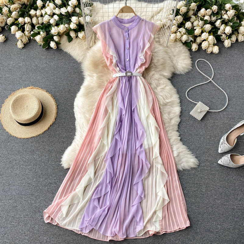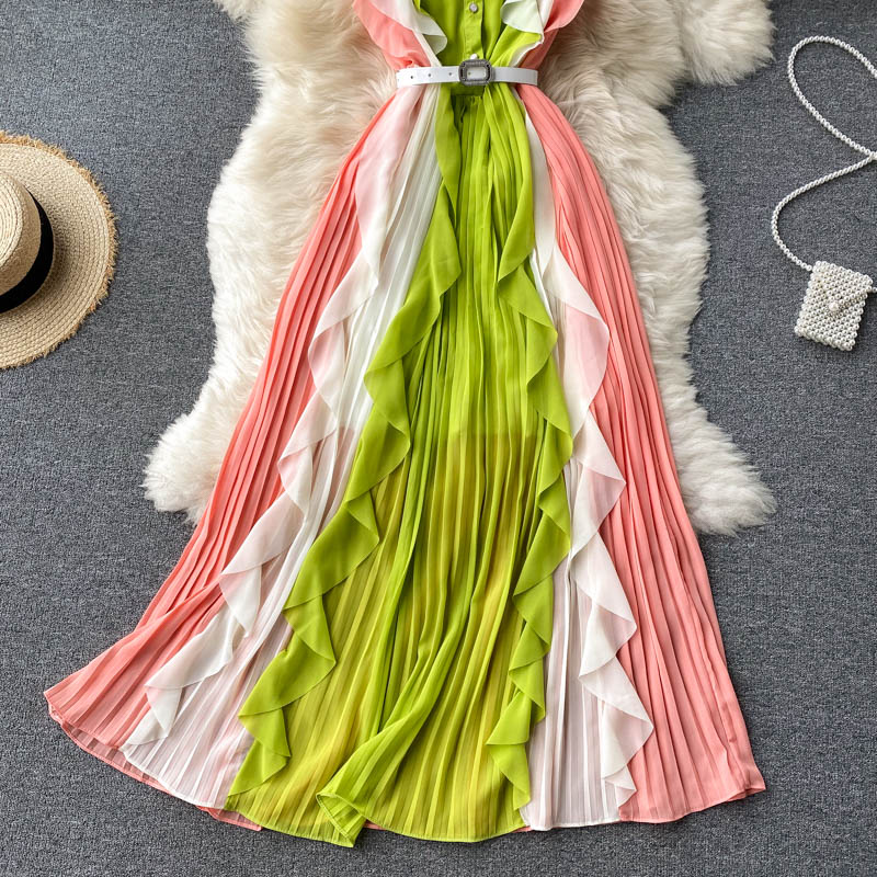 Summer Women Patchwork Chiffon Long Dress Vintage Round Neck Single Breasted Green/Purple Ruffle Draped Vestidos Female New
