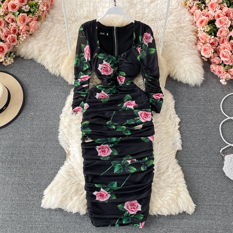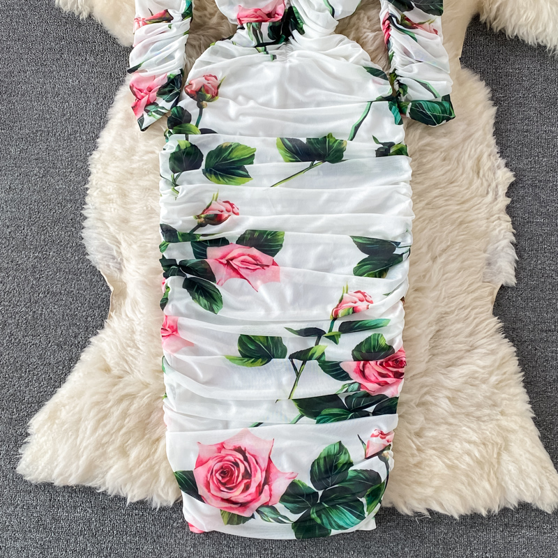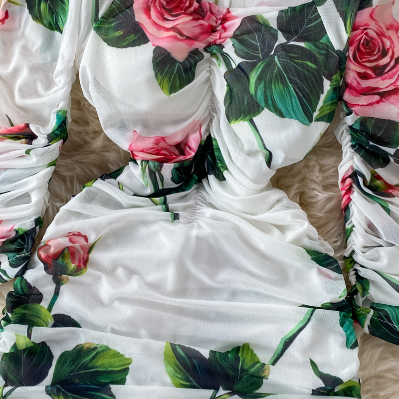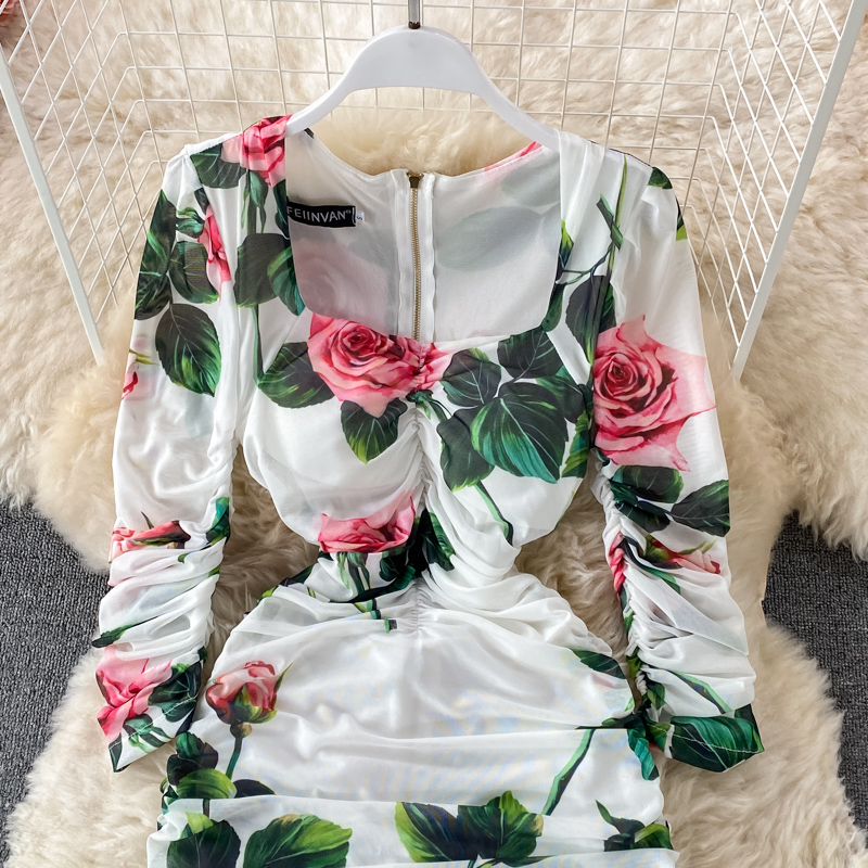 Black/White Floral Print Pleated Dress Women Vintage Square Collar Long Sleeve High Waist Draped Mesh Vestidos Female Runway New