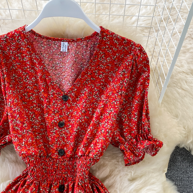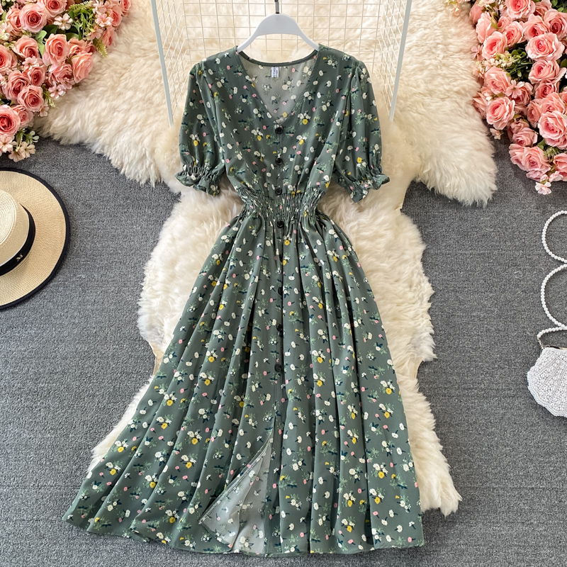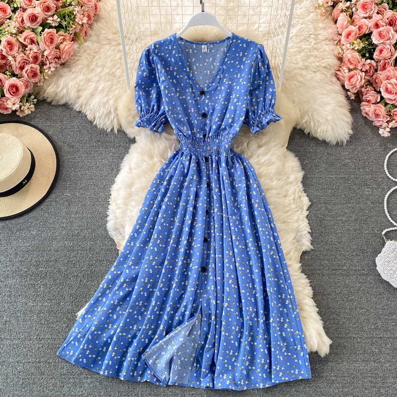 Cheap Dresses, Buy Quality Women’s Clothing Directly from China Suppliers:Vintage Women Single Breasted Printed Midi Dress Red/Blue/Green Puff Short Sleeve High Waist Vestidos Summer Female Robe