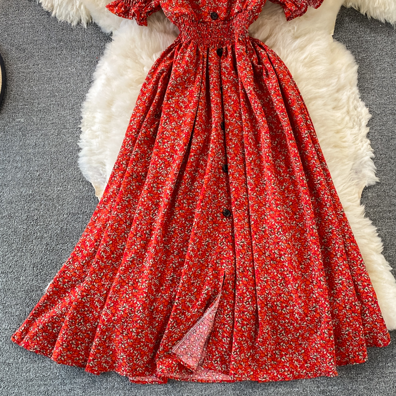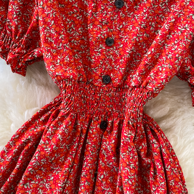 Vintage Women Single Breasted Printed Midi Dress Red/Blue/Green Puff Short Sleeve High Waist Vestidos Summer Female Robe