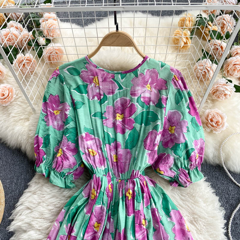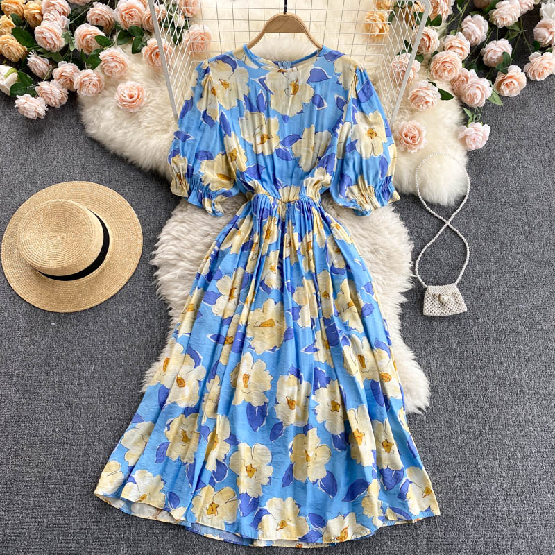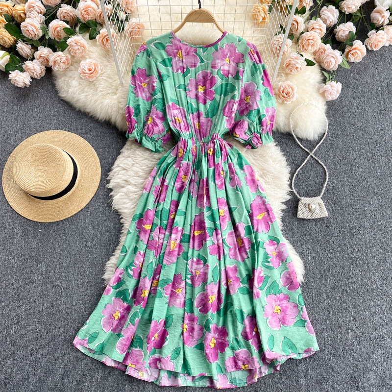 Cheap Dresses, Buy Quality Women’s Clothing Directly from China Suppliers:Women Black/Blue/Green Floral Printed Midi Dress Bohemian Elegant Round Neck Short Puff Sleeve Vacation Beach Vestidos Summer