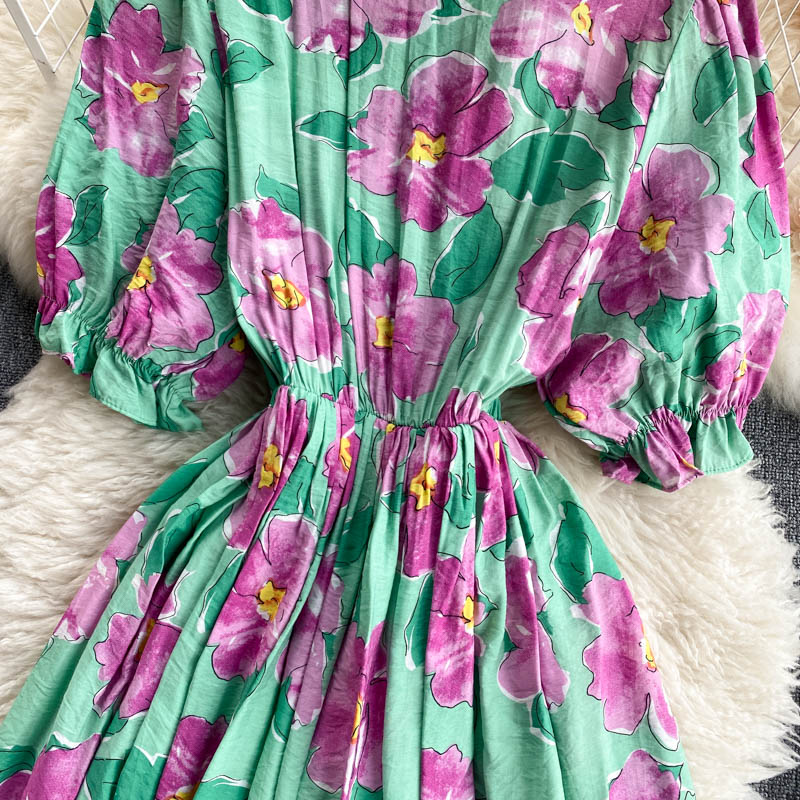Summer Women Floral Dress Vintage V-Neck Short Puff Sleeve High Waist Ruffle Mermaid Vestidos Elegant Party Robe Female New