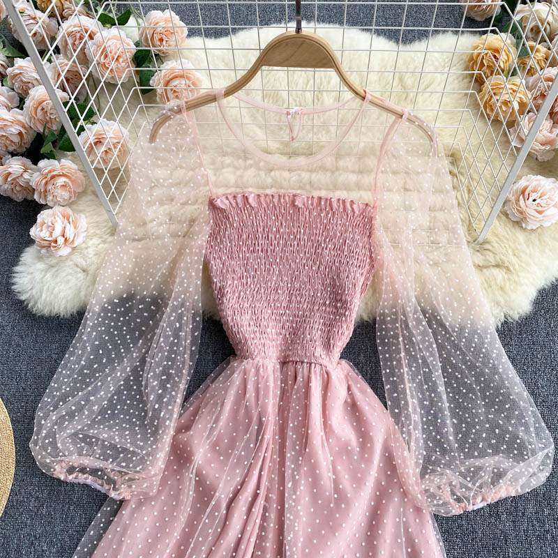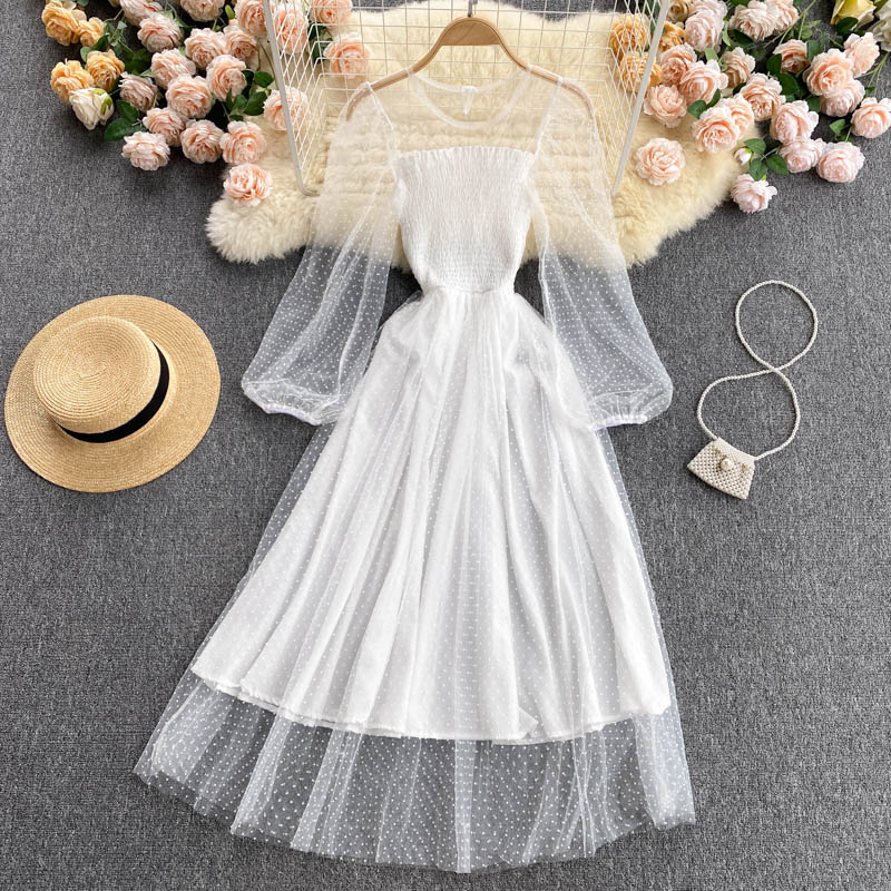 Cheap Dresses, Buy Quality Women’s Clothing Directly from China Suppliers:Summer Women Polka Dot Mesh Patchwork Midi Dress Vintage Round Neck Puff Long Sleeve High Waist A Line Vestidos Female New