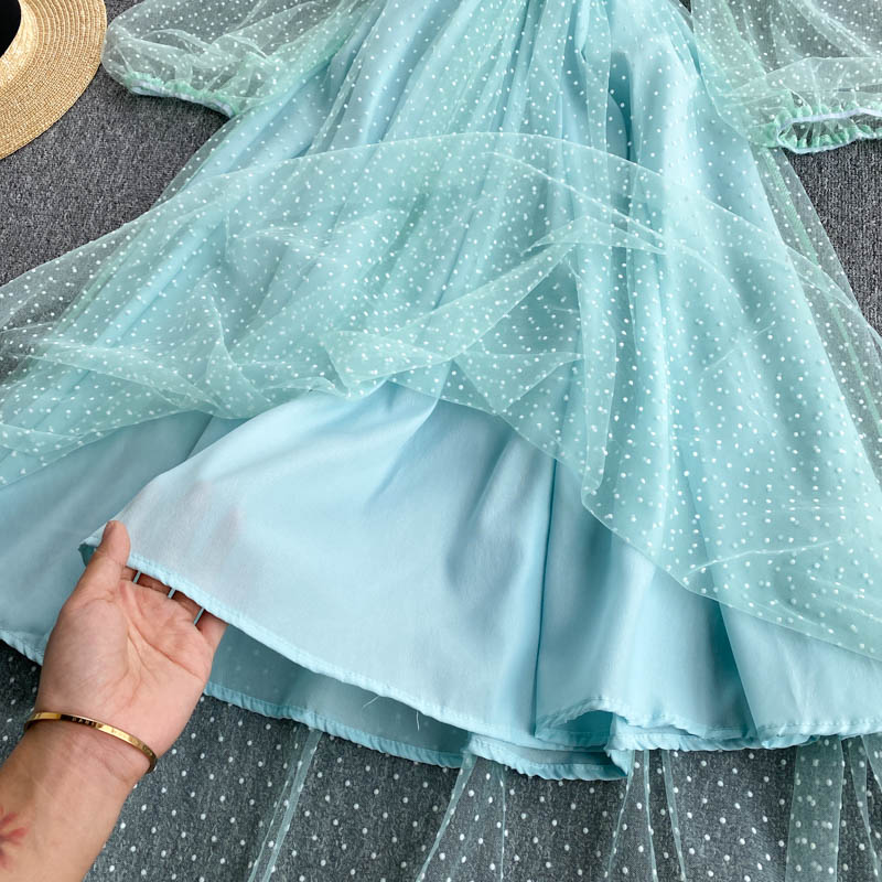 Summer Women Polka Dot Mesh Patchwork Midi Dress Vintage Round Neck Puff Long Sleeve High Waist A-Line Vestidos Female New