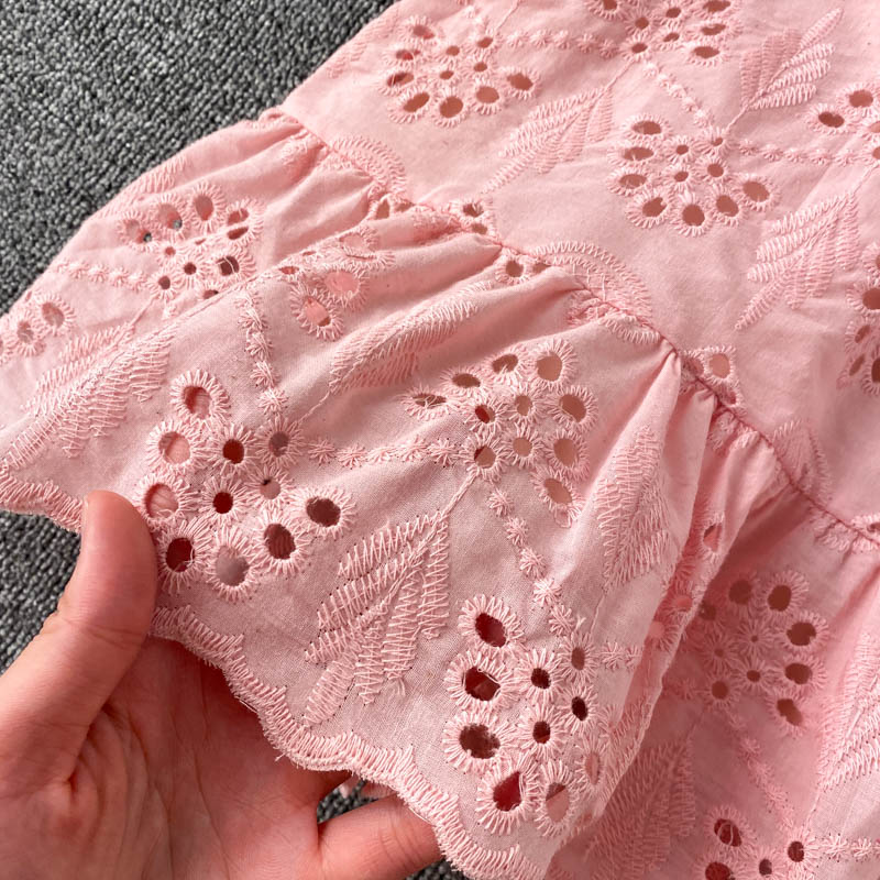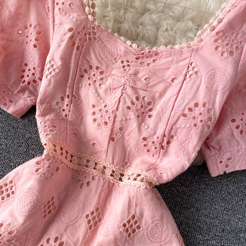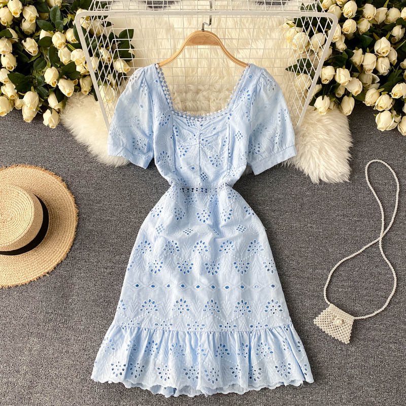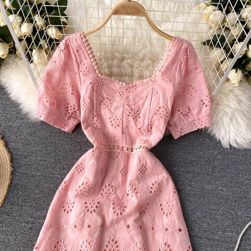Yellow/Pink/Blue Hollow Out Mini Dress Women Summer Square Collar Short Puff Sleeve Vintage Vestidos Ladies Ruffle Robe New