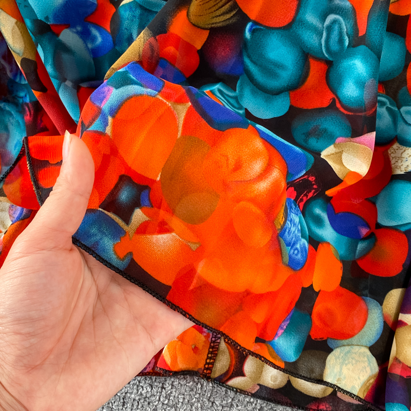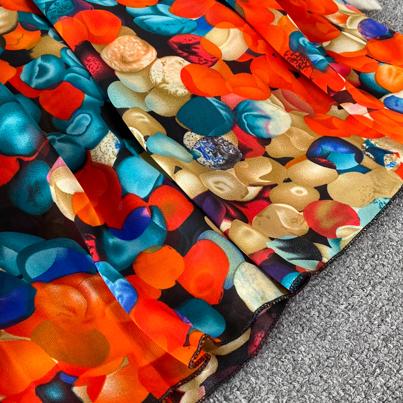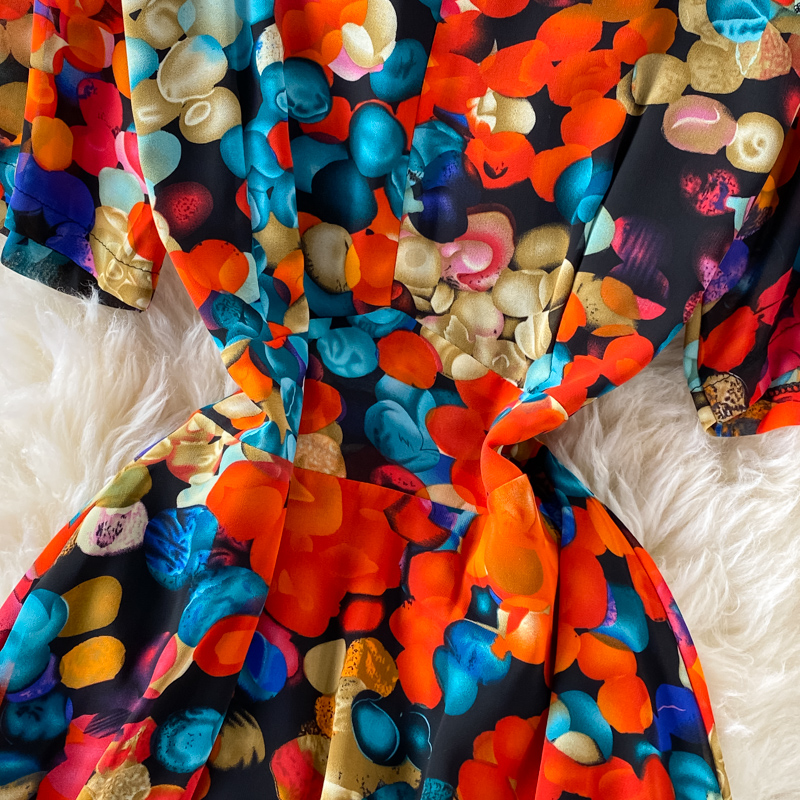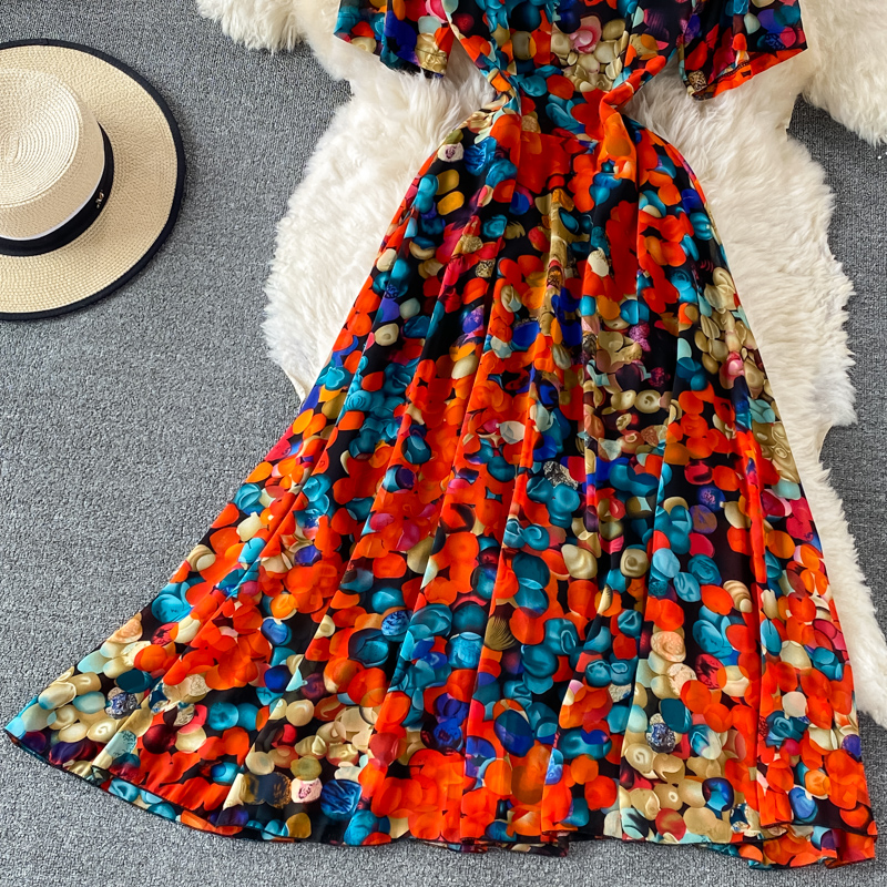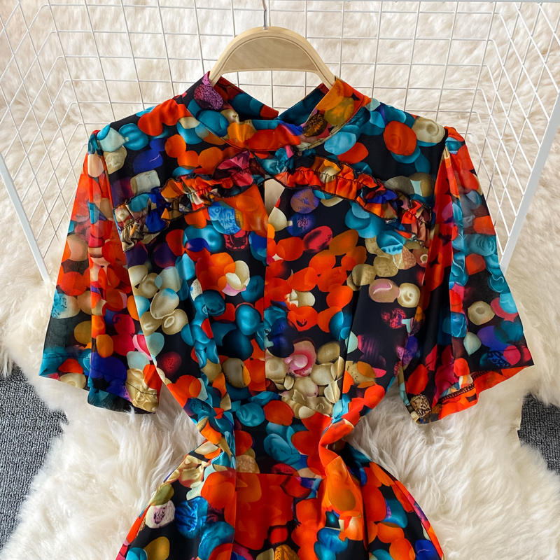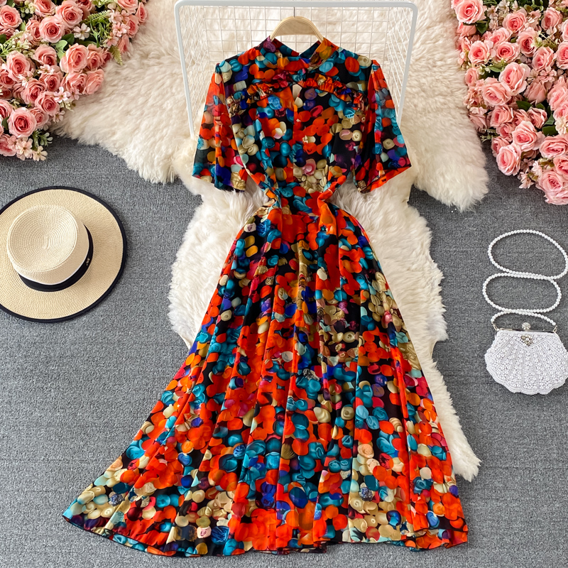Summer Bohemian Printed Chiffon Long Dress Women Elegant Stand Collar Short Sleeve High Waist A-Line Robe Female Summer New