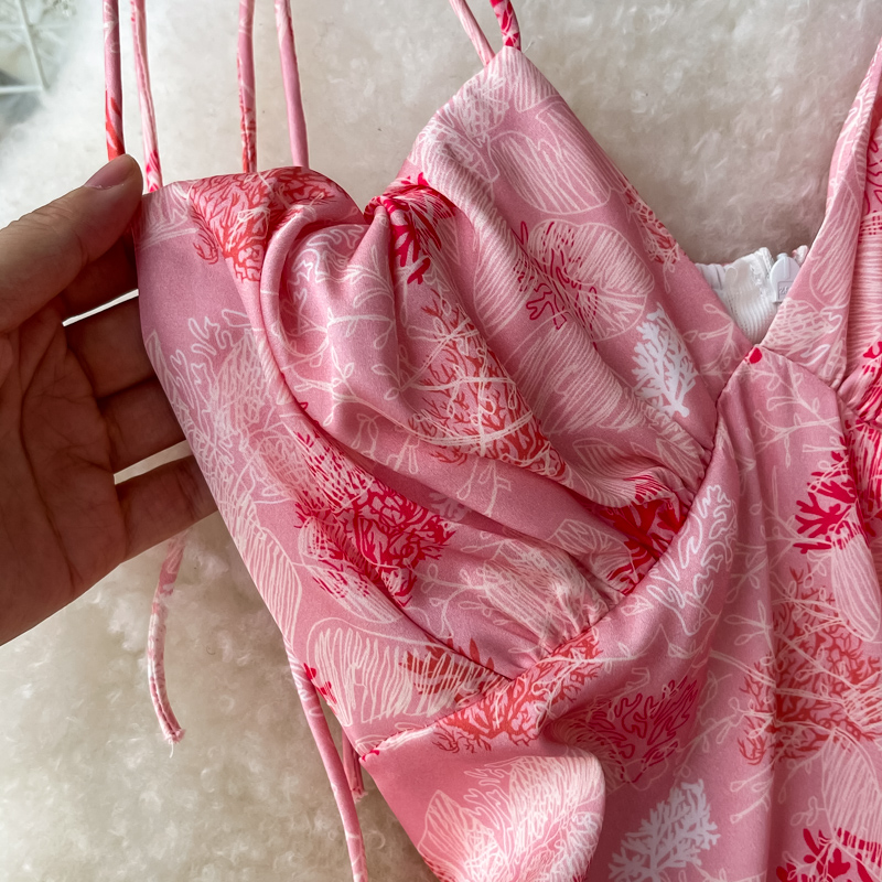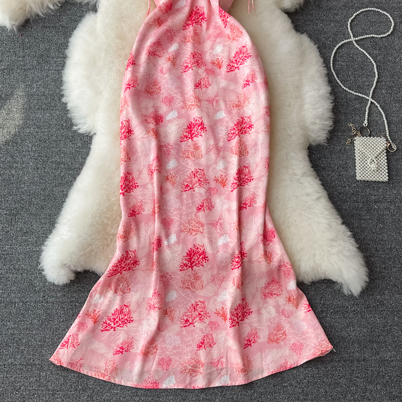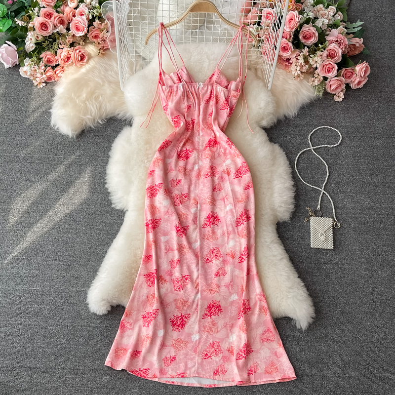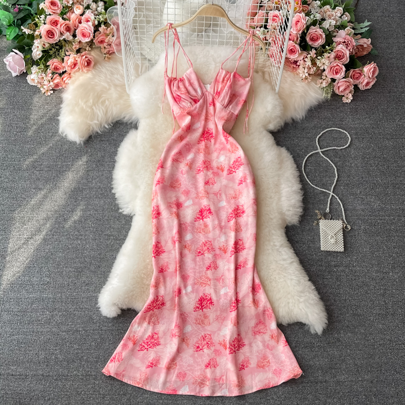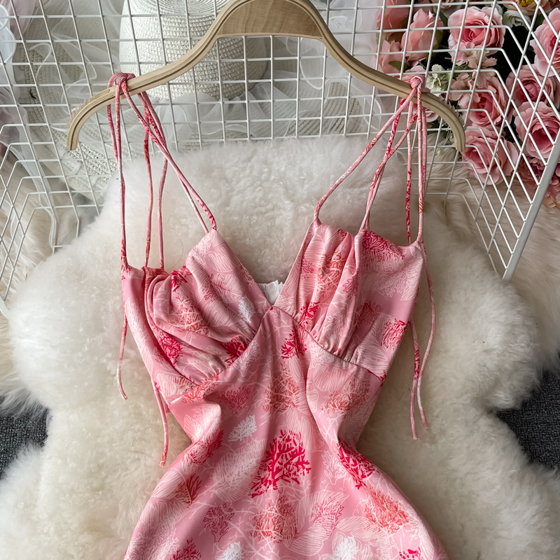 Summer Sexy Beach Pink Spaghetti Strap Dress Women Vintage V-Neck Sleeveless High Waist Bodycon Vestidos Female Party Robe