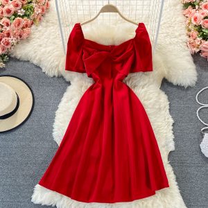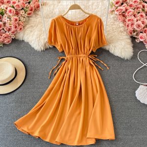 Yellow/Brown/Beige/Black Drawstring Draped Dress Women Vintage Round Neck Short Sleeve High Waist A-Line Loose Vestidos Summer