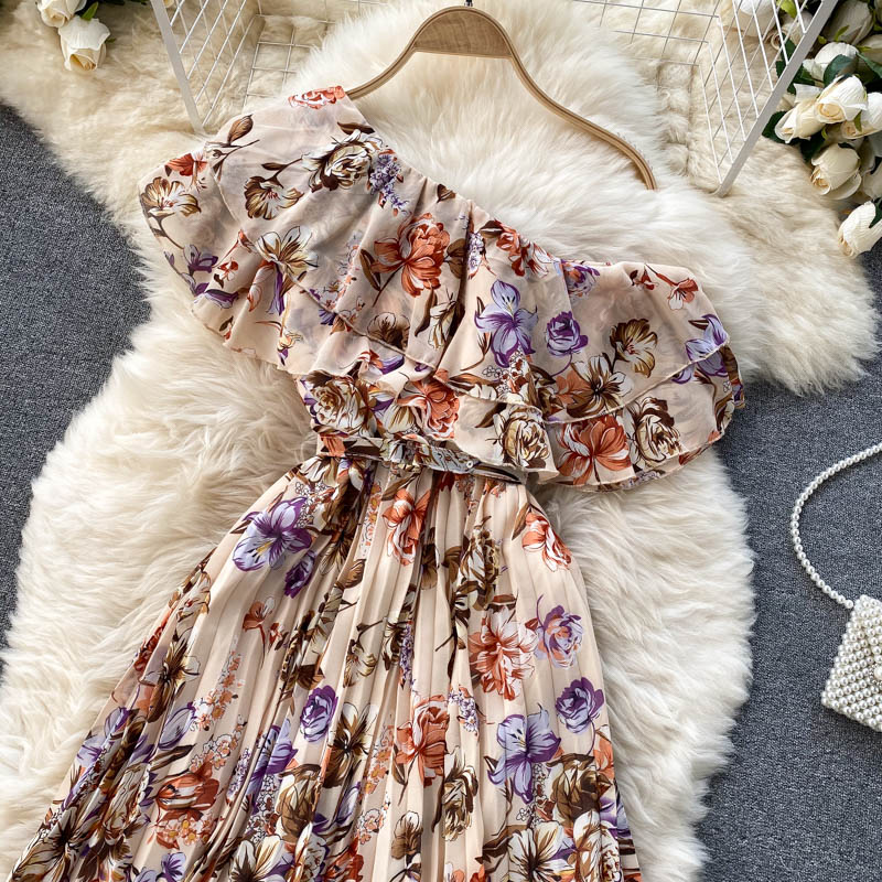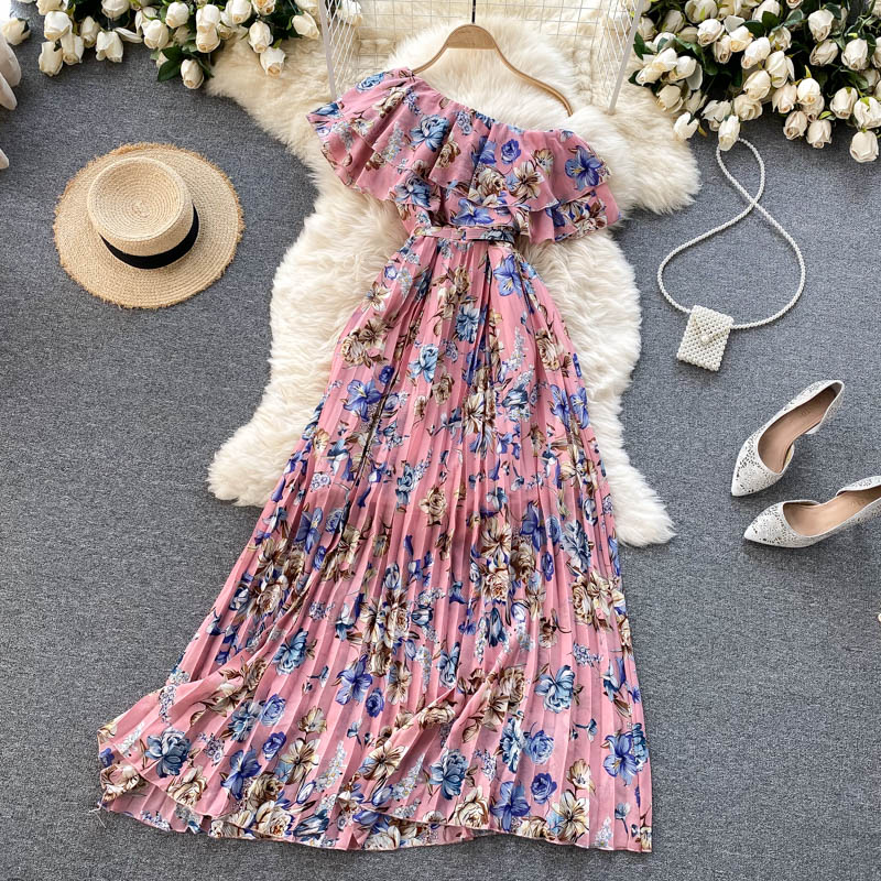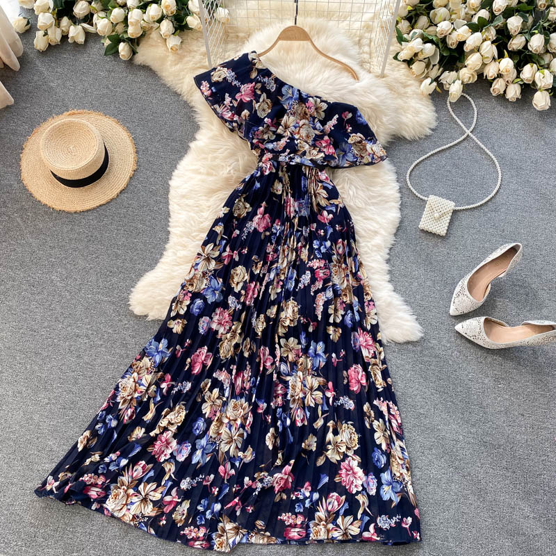 Cheap Dresses, Buy Quality Women’s Clothing Directly from China Suppliers:Women Floral Printed Chiffon Pleated Long Dress Summer Sexy Diagonal Collar Short Sleeve Ruffle Draped Vestidos Female New