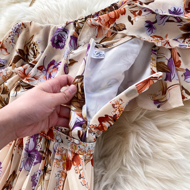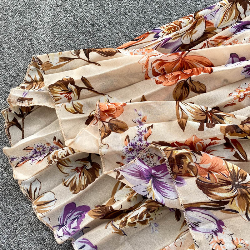 Women Floral Printed Chiffon Pleated Long Dress Summer Sexy Diagonal Collar Short Sleeve Ruffle Draped Vestidos Female New