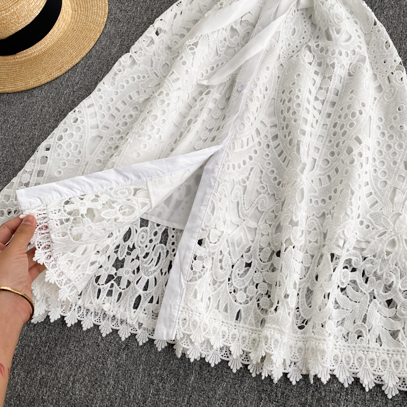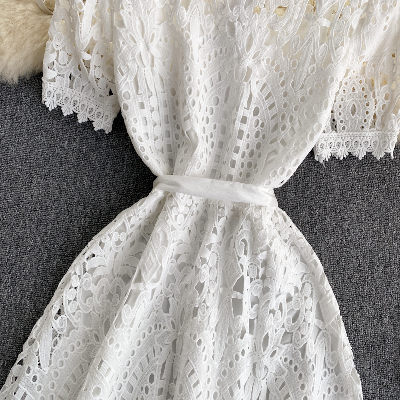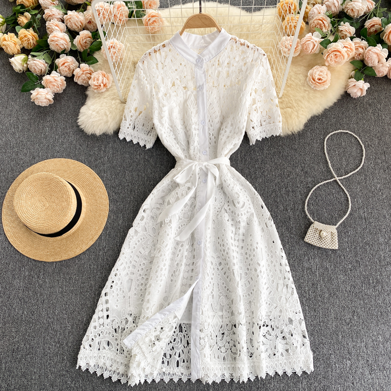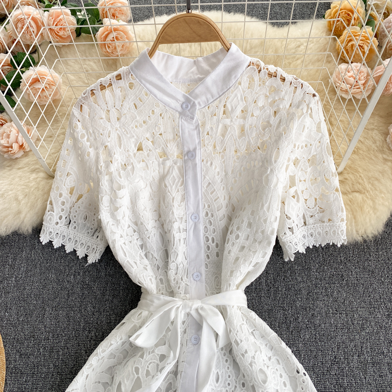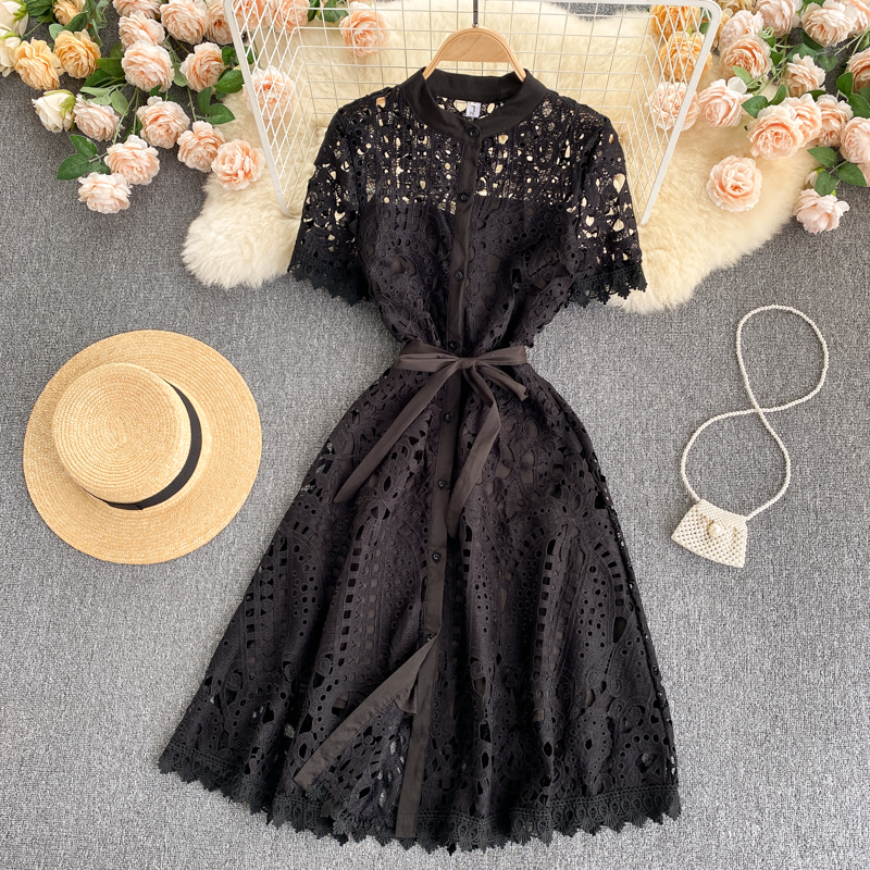 Summer Black/White Hollow Out Women Single Breasted Dress Female Vintage Short Sleeve High Waist Party Vestidos Female Robe