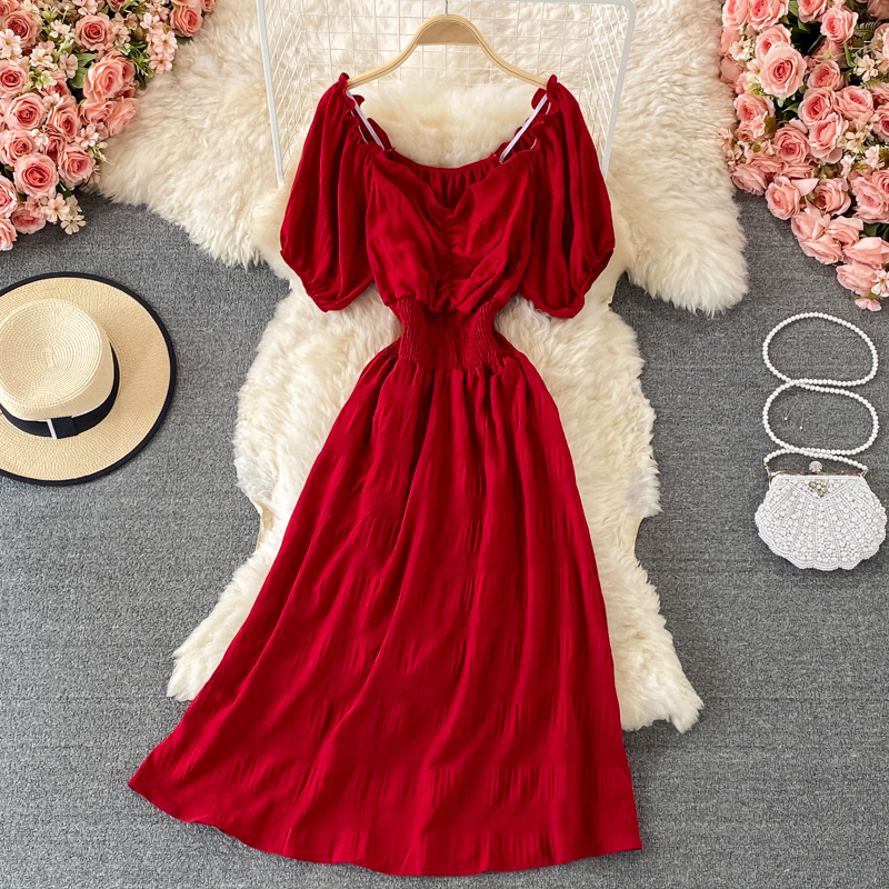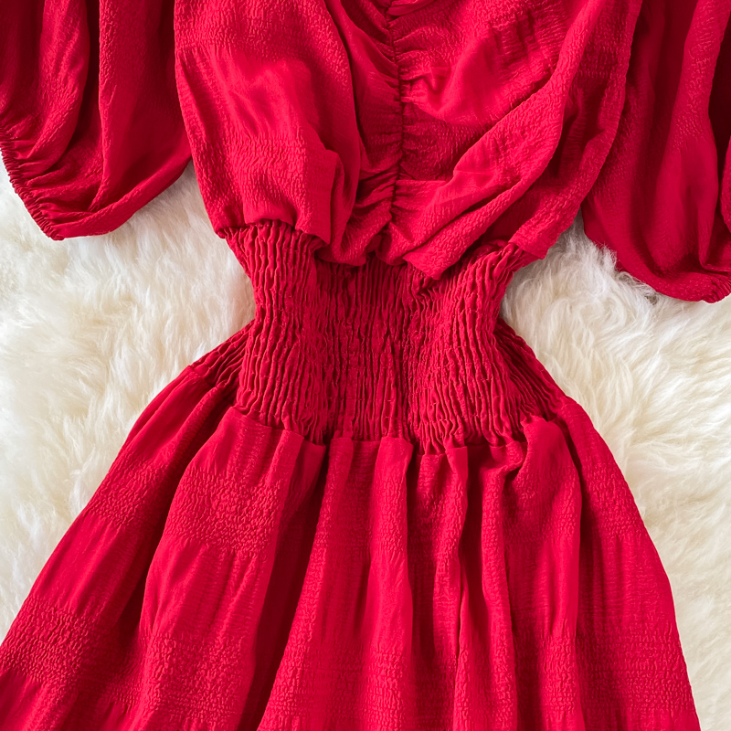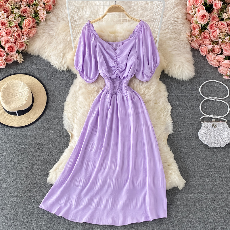 Cheap Dresses, Buy Quality Women’s Clothing Directly from China Suppliers:Vintage Purple/Red/White Draped Midi Dress Women Summer Sexy V Neck Puff Short Sleeve High Waist A Line Slim Vestidos New