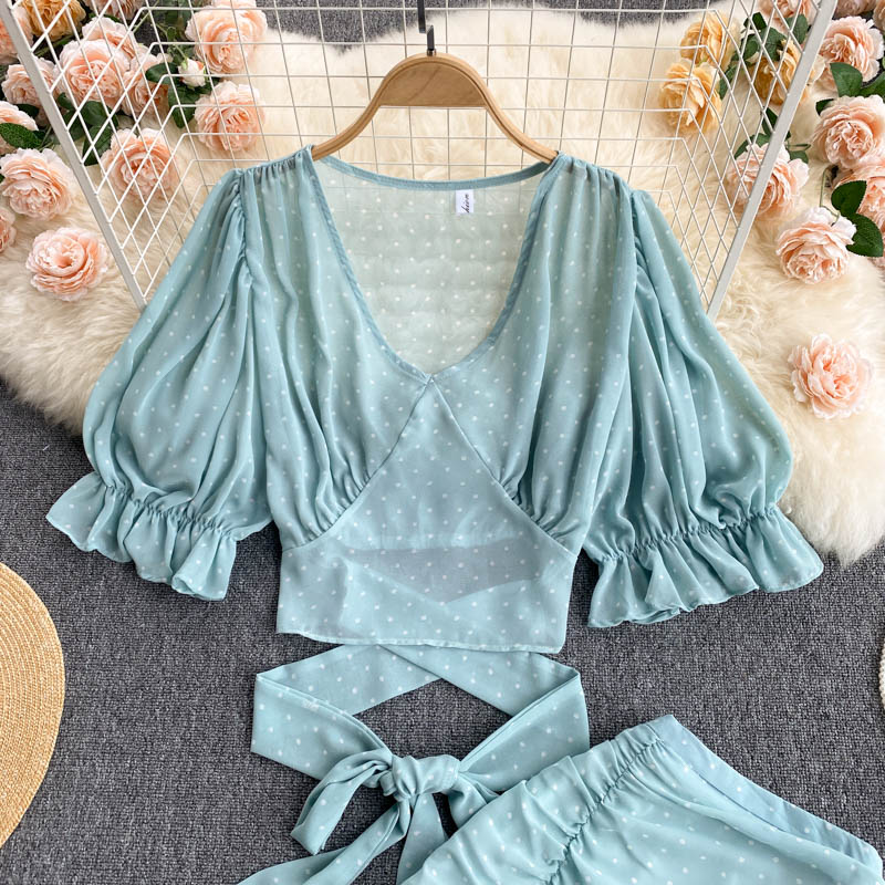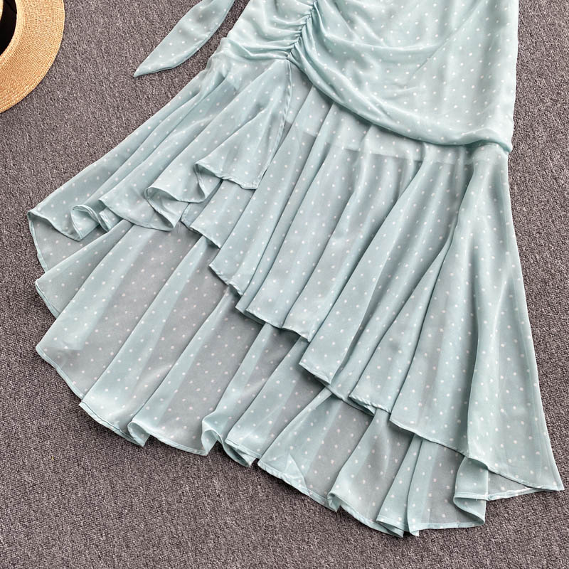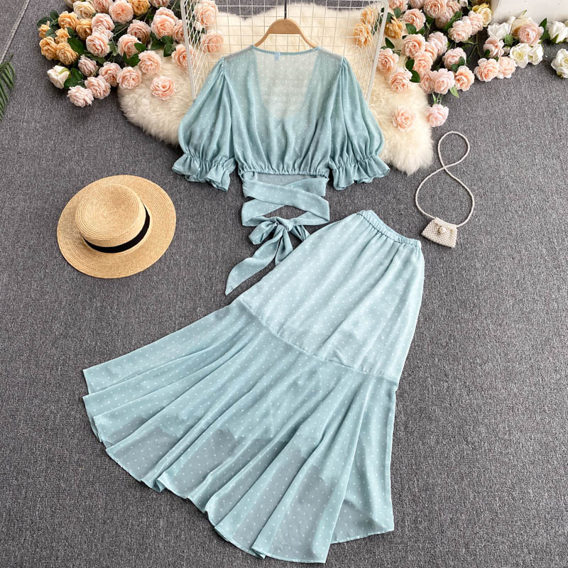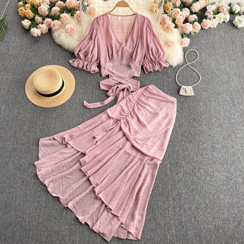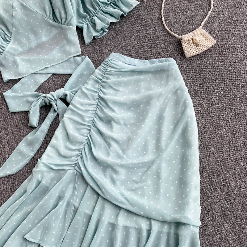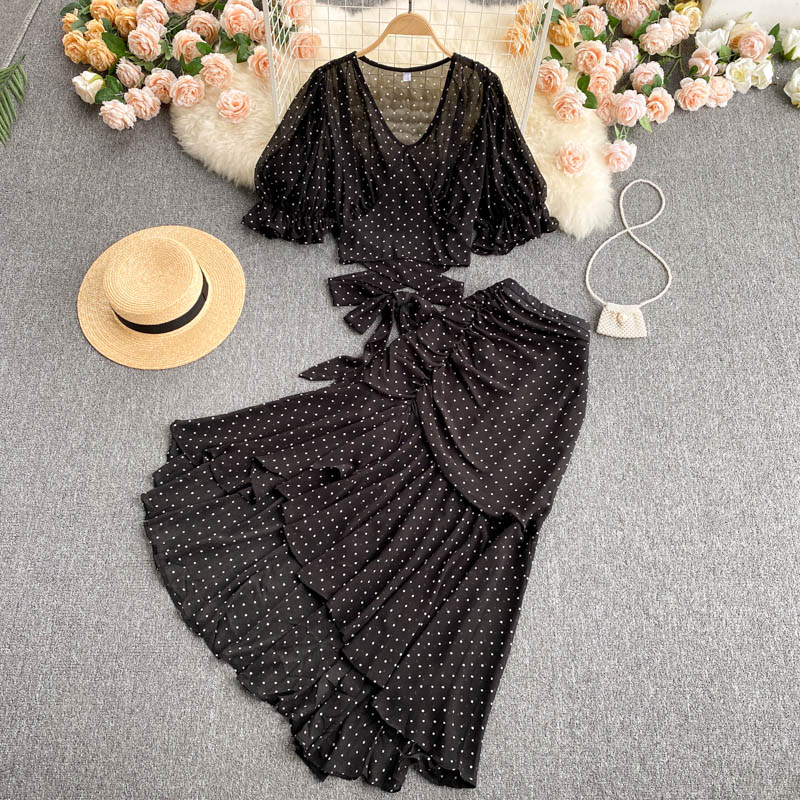 Sexy Polka Dot Chiffon 2pcs Set Women Elegant Flare Sleeve Short Bandage Tops + Ruffle Irregular Skirt Female Two Piece Suit New