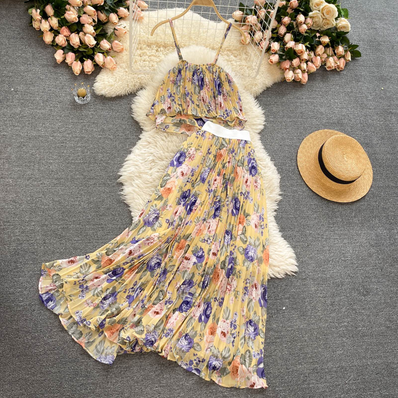 Cheap Dress Suits, Buy Quality Women’s Clothing Directly from China Suppliers:Sexy Floral Printed Two Piece Set Summer Beach Party Draped Short Tops + Pleated Midi Skirt Female Bohemian Chiffon Suit