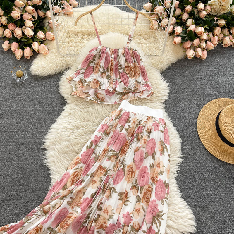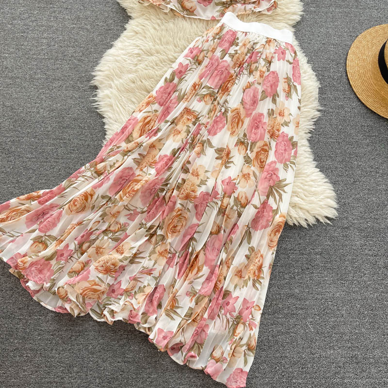 Sexy Floral Printed Two Piece Set Summer Beach Party Draped Short Tops + Pleated Midi Skirt Female Bohemian Chiffon Suit