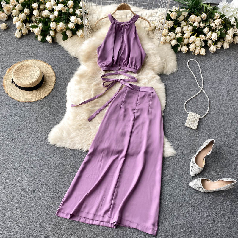 Cheap Dress Suits, Buy Quality Women’s Clothing Directly from China Suppliers:Vintage Purple/Yellow/Khaki Bandage Two Piece Set Women Halter Short Tops + High Waist A Line Skirt Female 2pcs Suits New