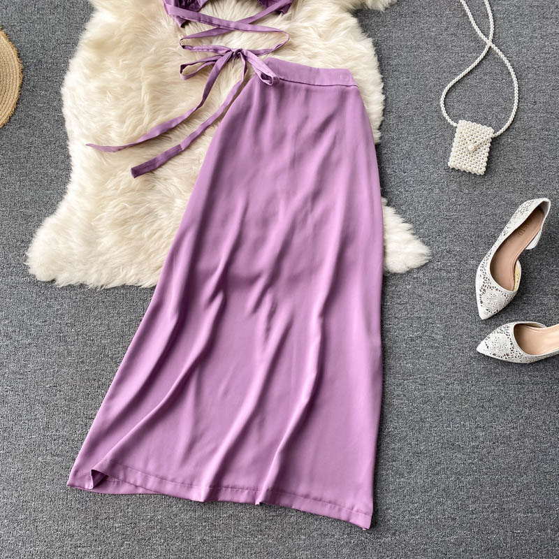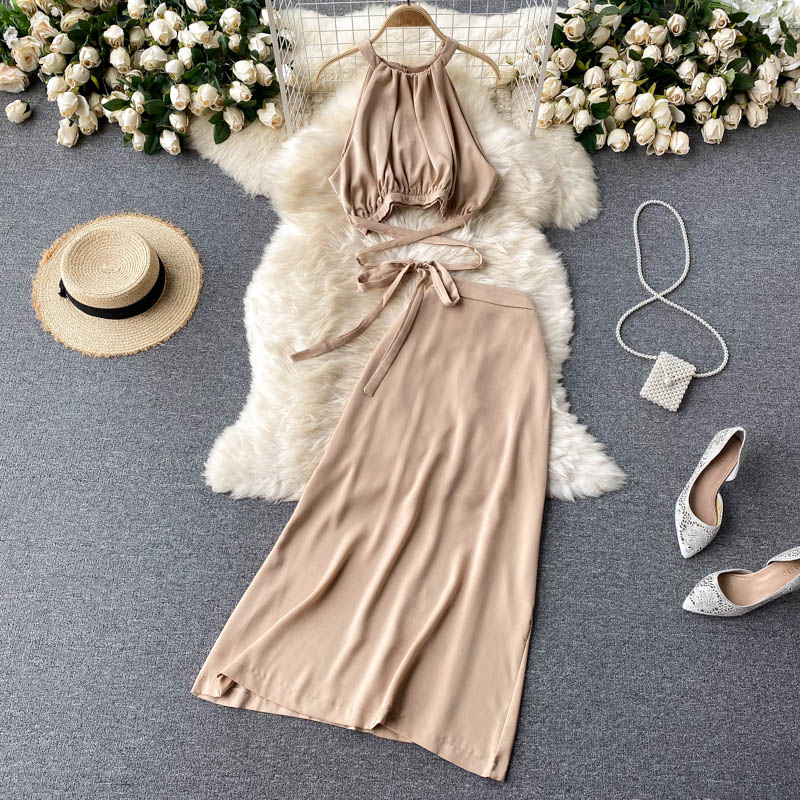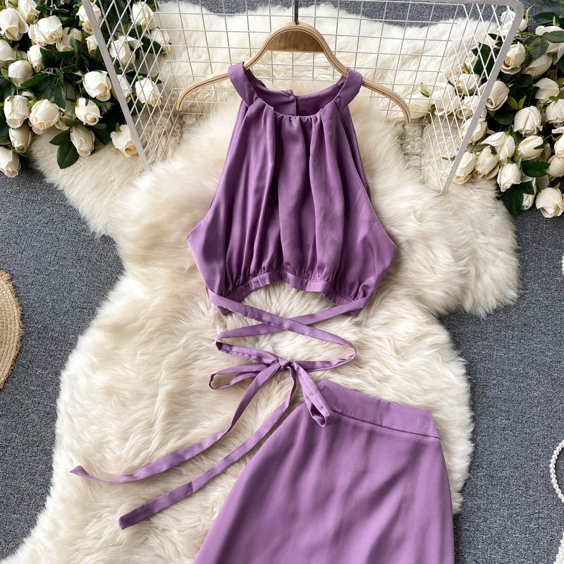 Vintage Purple/Yellow/Khaki Bandage Two Piece Set Women Halter Short Tops + High Waist A-Line Skirt Female 2pcs Suits New