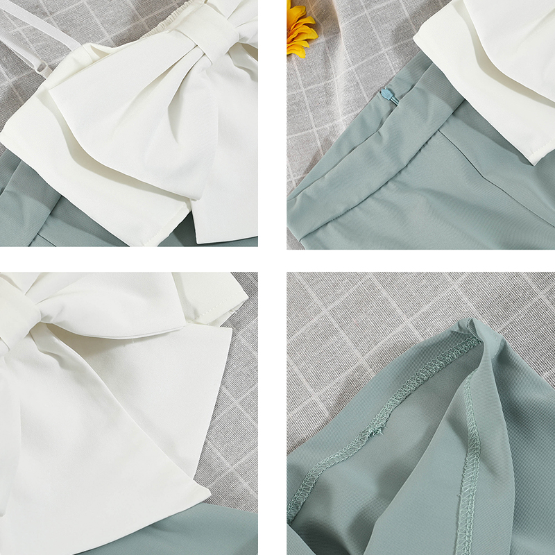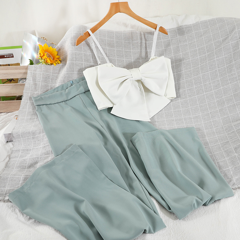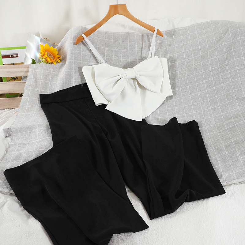 Women Two Piece Set Sexy White Spaghetti Strap Bow Camis Tops + Black/Blue Wide Leg Pants Female Casual 2pcs Suits Fashion