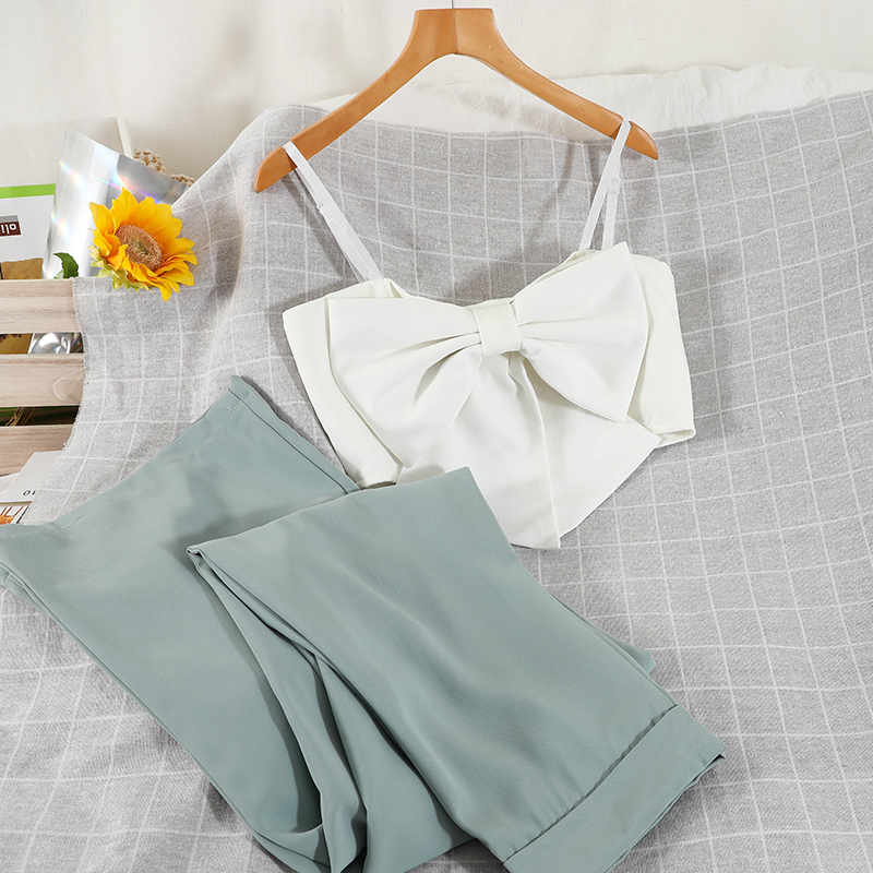 Cheap Pant Suits, Buy Quality Women’s Clothing Directly from China Suppliers:Women Two Piece Set Sexy White Spaghetti Strap Bow Camis Tops + Black/Blue Wide Leg Pants Female Casual 2pcs Suits Fashion