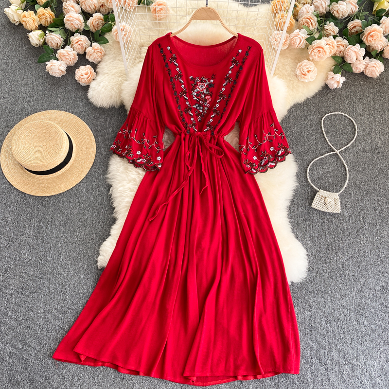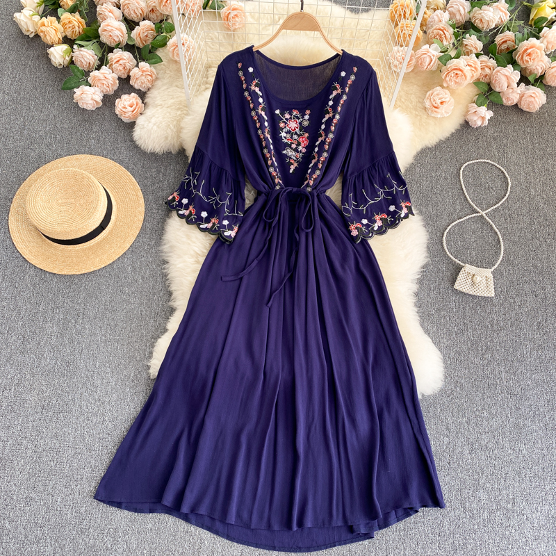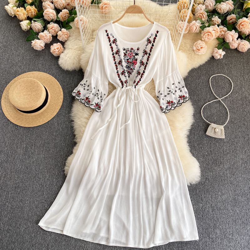 Cheap Dresses, Buy Quality Women’s Clothing Directly from China Suppliers:Indie Folk Women White/Blue/Yellow/Red Embroidered Midi Dress Spring Autumn Flare Sleeve O Neck High Waist Vestidos New
