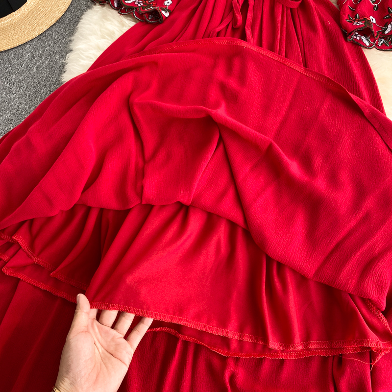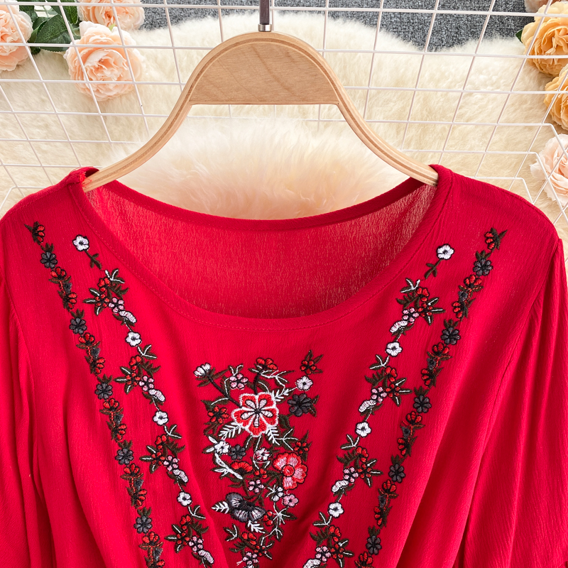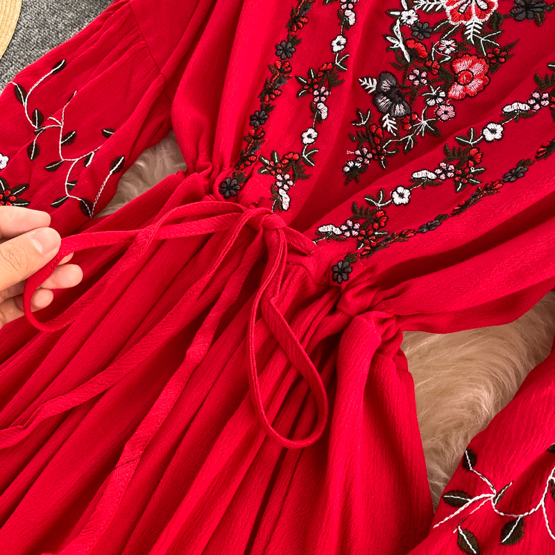 Indie Folk Women White/Blue/Yellow/Red Embroidered Midi Dress Spring Autumn Flare Sleeve O-Neck High Waist Vestidos New