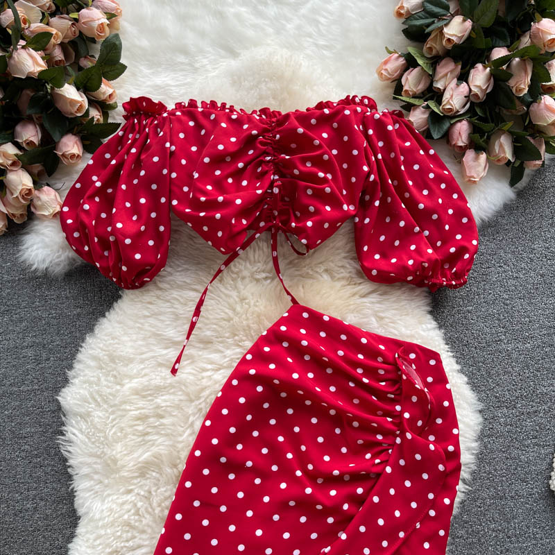 Women Red/Purple/Black Polka Dot Two Piece Set Summer Sexy Ruffle Short Drawstring Tops + High Waist Irregular Skirt 2pcs Suit