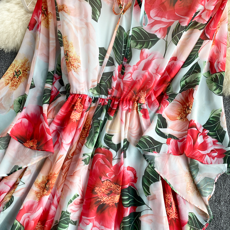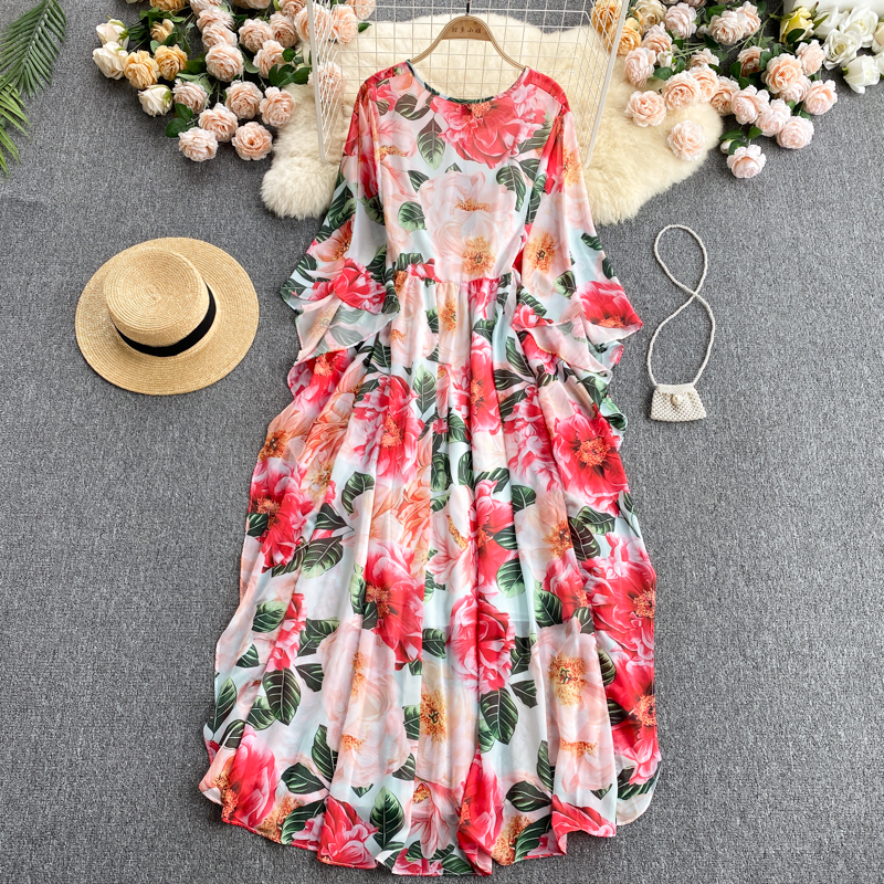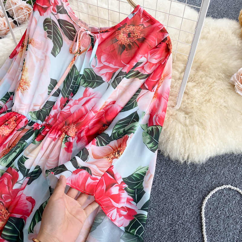 Red Floral Printed Long Dress Women Bohemian O-Neck Long Sleeve High Waist Ruffle Vestido Vacation Beach Robe Spring Autumn
