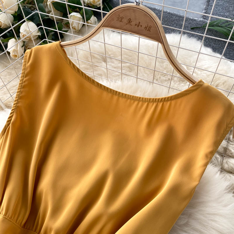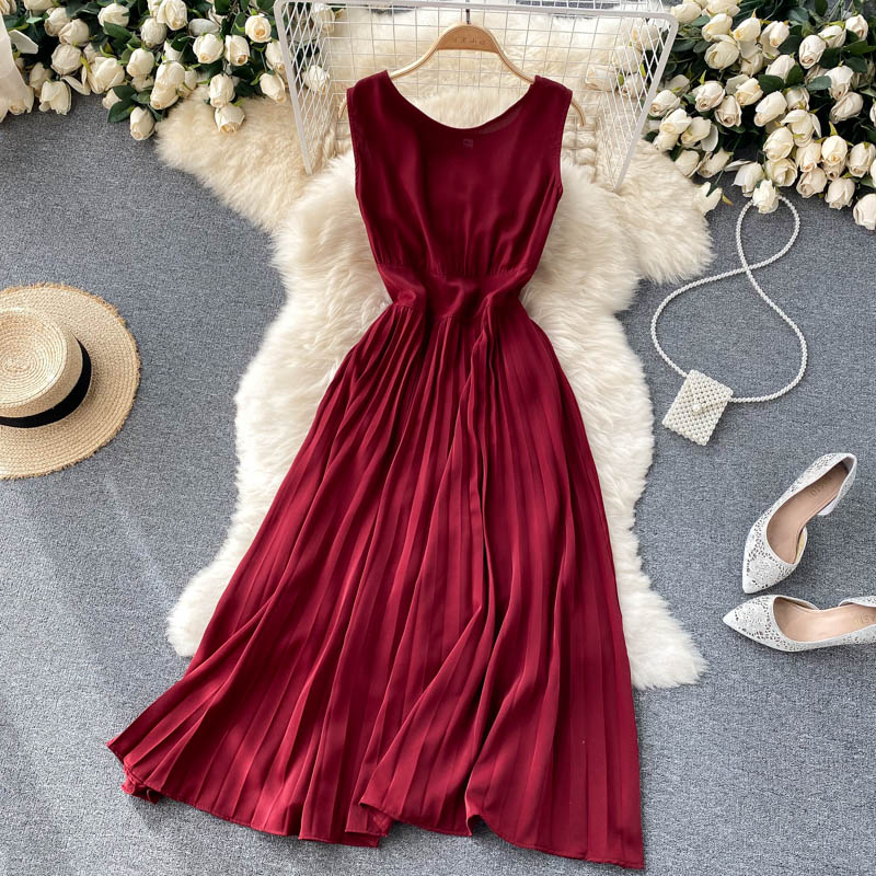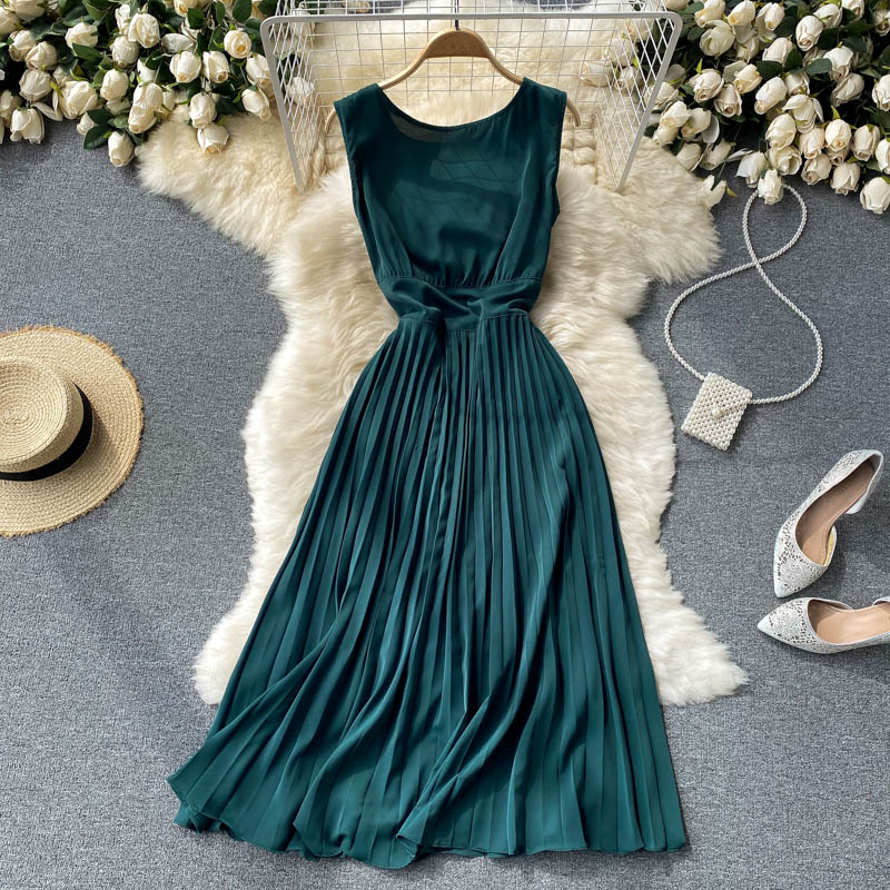 Cheap Dresses, Buy Quality Women’s Clothing Directly from China Suppliers:Summer Vintage Yellow/Green/Blue Pleated Dress Women Elegant Round Neck Sleeveless High Waist Draped Vestidos Female New