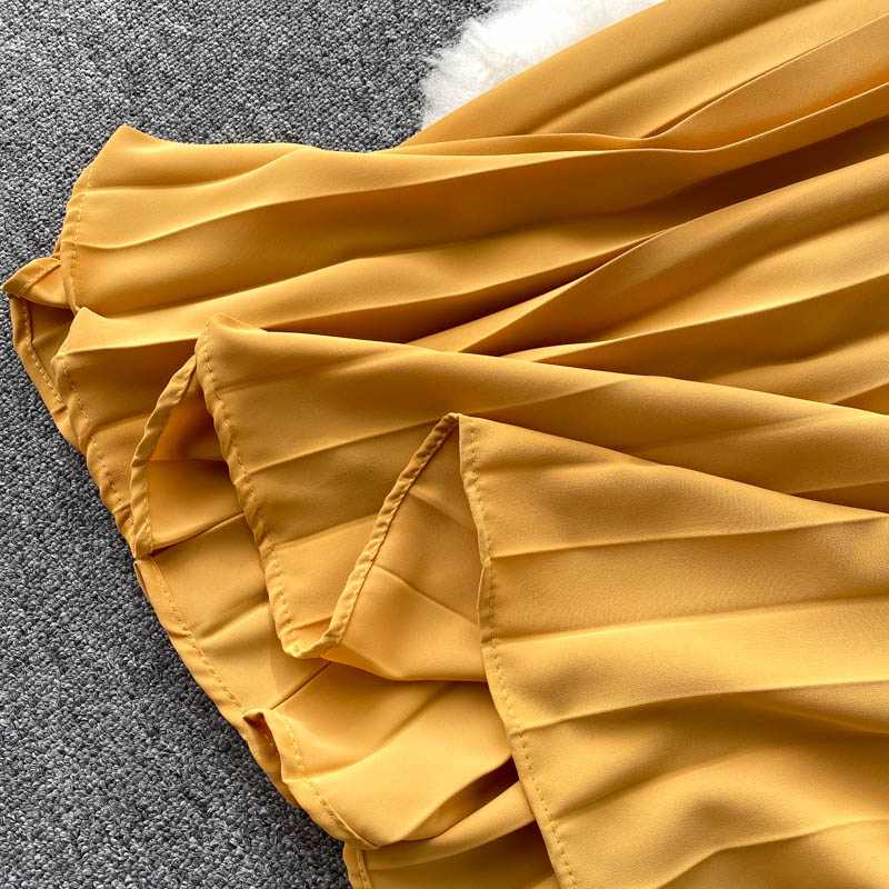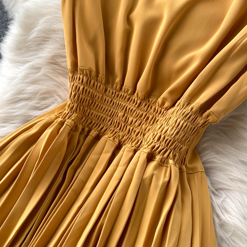 Summer Vintage Yellow/Green/Blue Pleated Dress Women Elegant Round Neck Sleeveless High Waist Draped Vestidos Female New