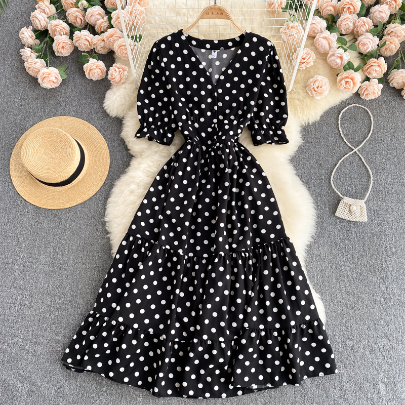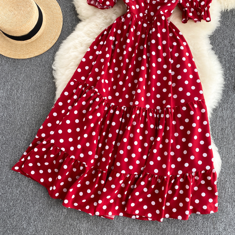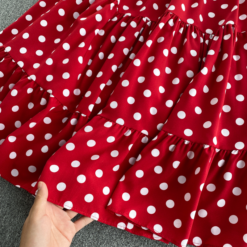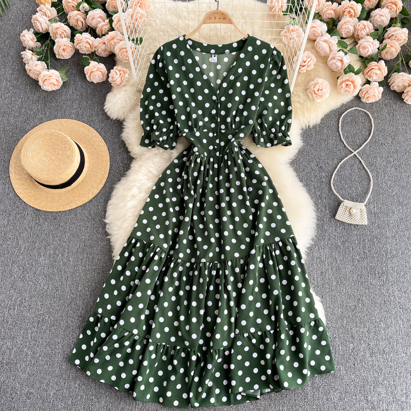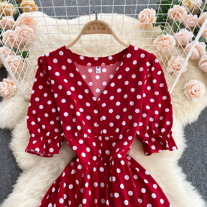 Summer Vintage Red/Beige/Green Polka Dot Dress Women Elegant V-Neck Single Breasted Short Sleeve High Waist Vestidos Female