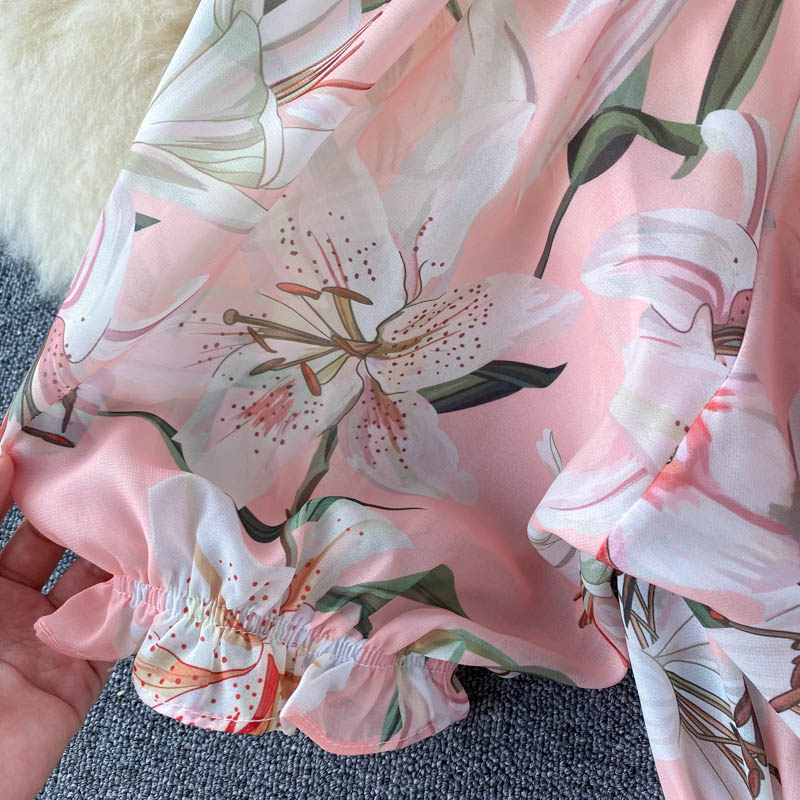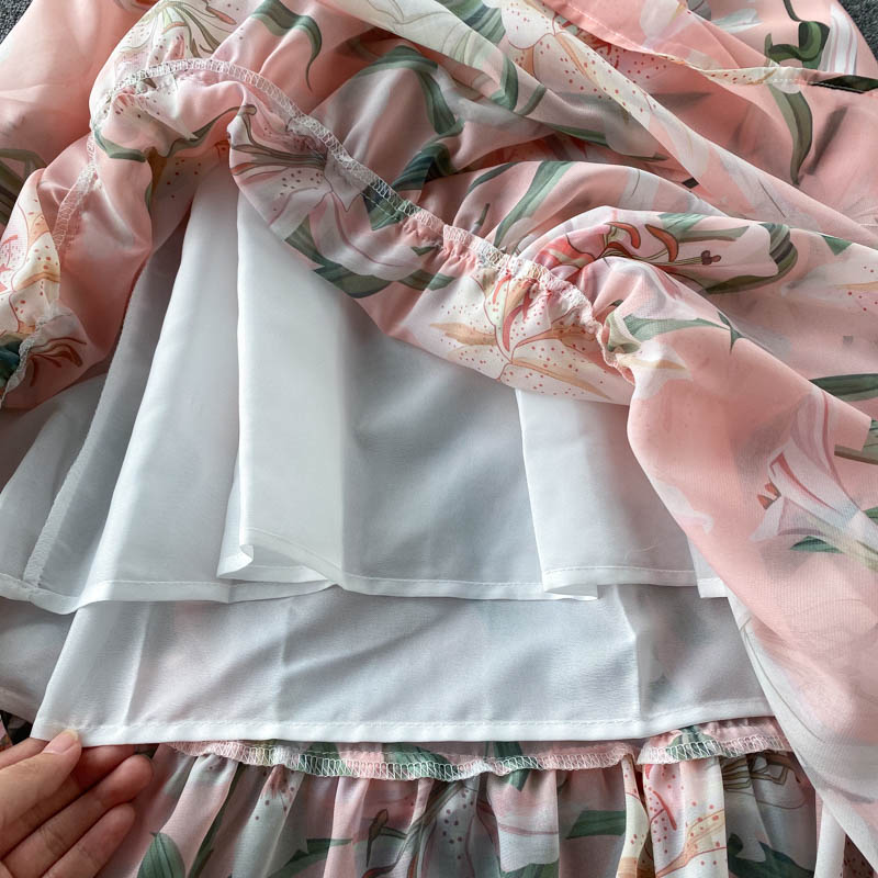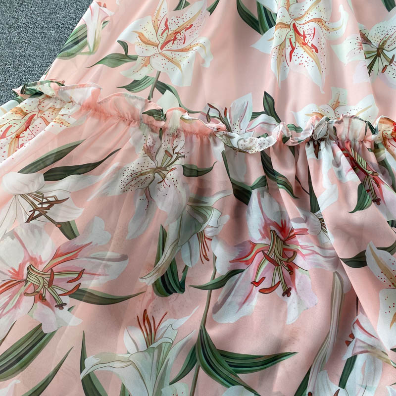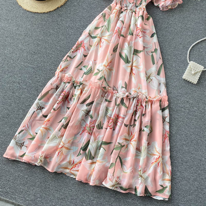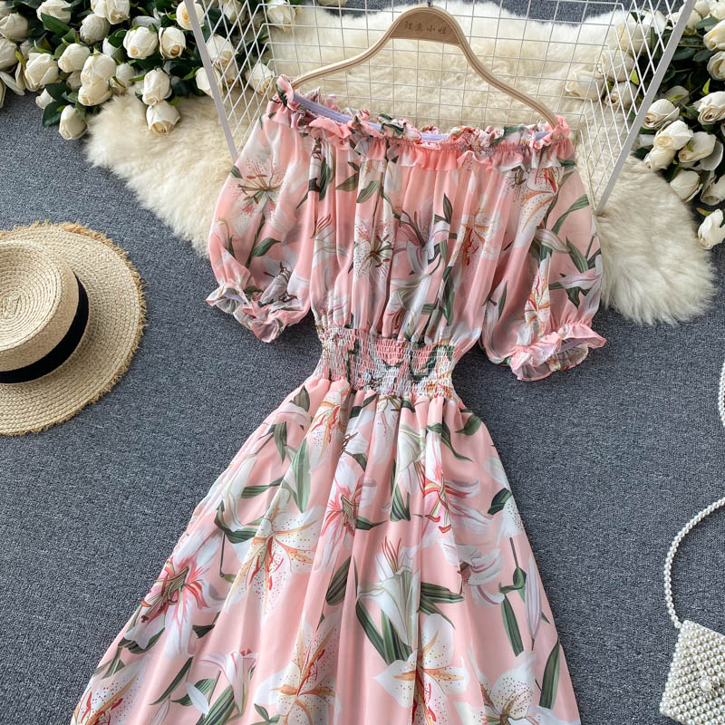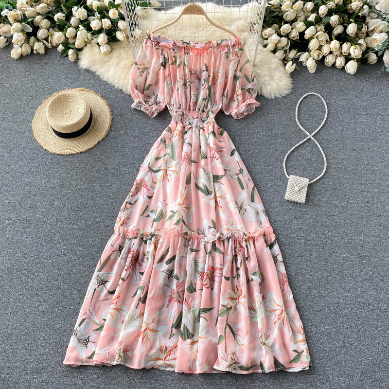 Summer Bohemian Pink Floral Printed Long Dress Sexy Slash Neck Ruffle Chiffon Vestidos Female Elegant Beach Party Robe New