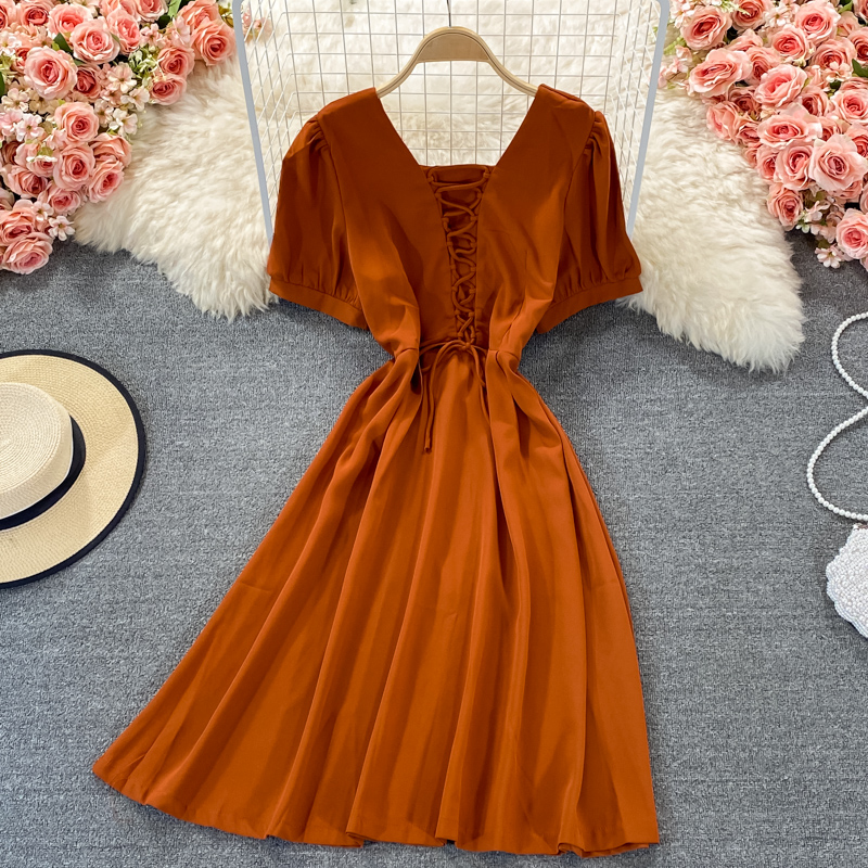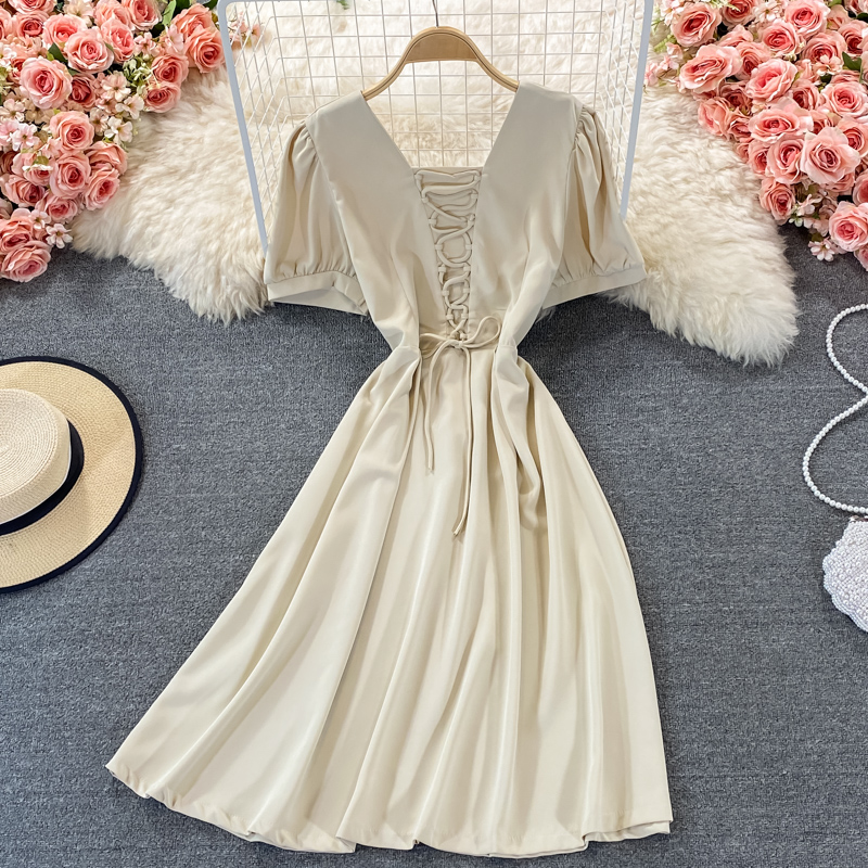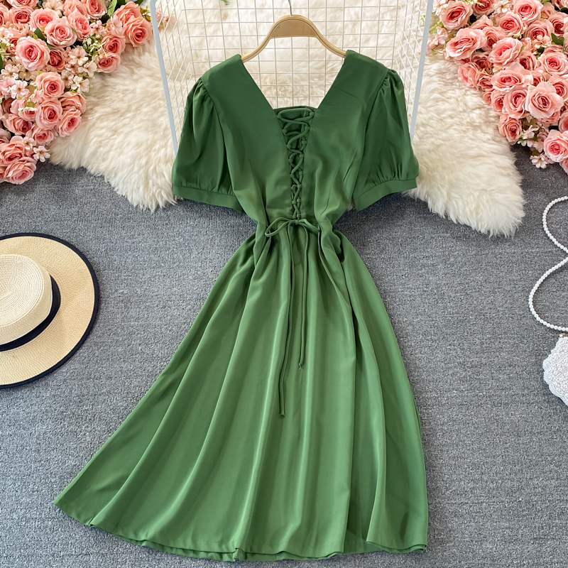 Cheap Dresses, Buy Quality Women’s Clothing Directly from China Suppliers:Vintage Green/Beige/Brown Drawstring Dress Women Elegant Square Collar Short Sleeve High Waist A Line Vestidos Summer Robe