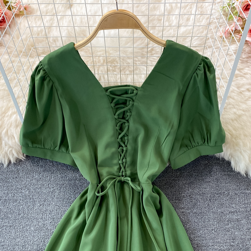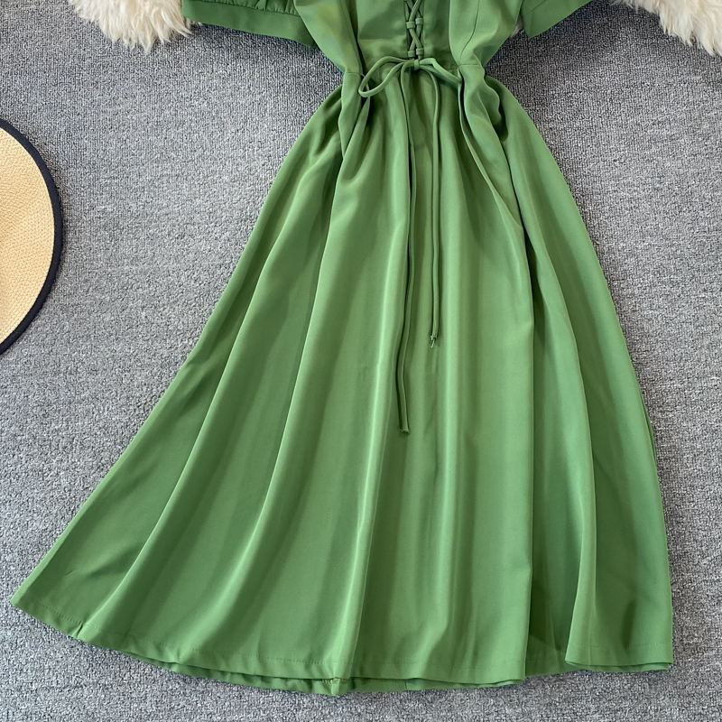 Vintage Green/Beige/Brown Drawstring Dress Women Elegant Square Collar Short Sleeve High Waist A-Line Vestidos Summer Robe