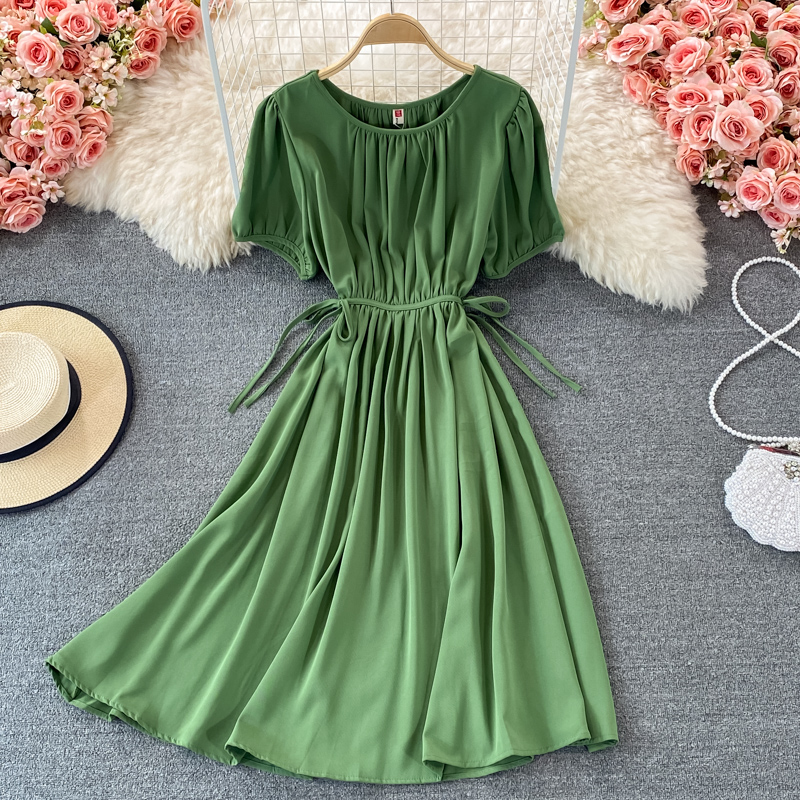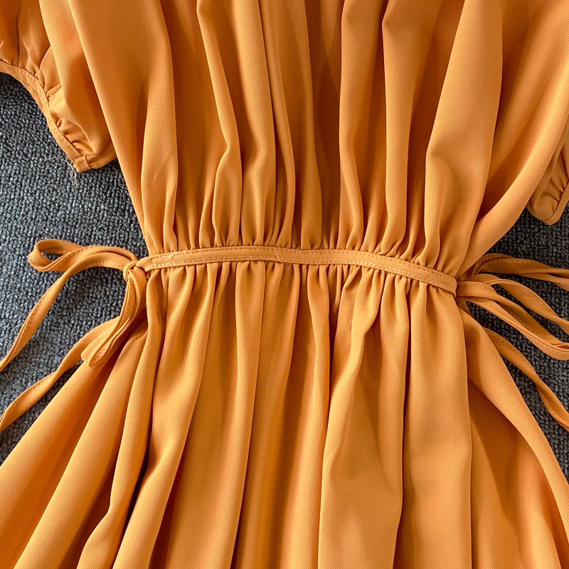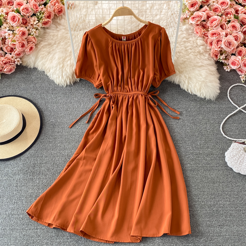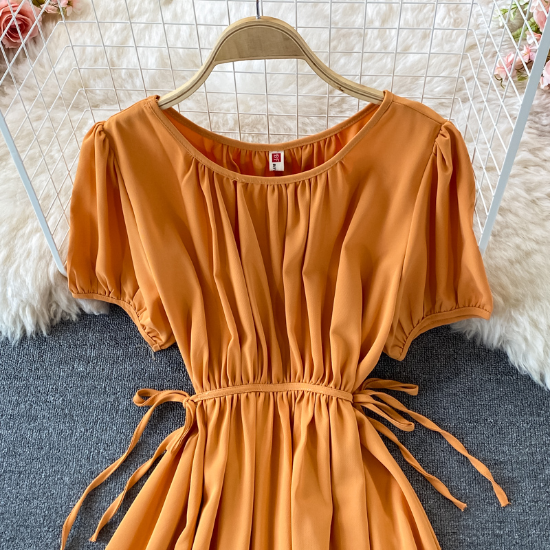 Yellow/Brown/Beige/Black Drawstring Draped Dress Women Vintage Round Neck Short Sleeve High Waist A-Line Loose Vestidos Summer