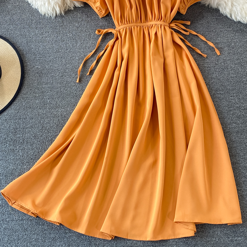 Cheap Dresses, Buy Quality Women’s Clothing Directly from China Suppliers:Yellow/Brown/Beige/Black Drawstring Draped Dress Women Vintage Round Neck Short Sleeve High Waist A Line Loose Vestidos Summer