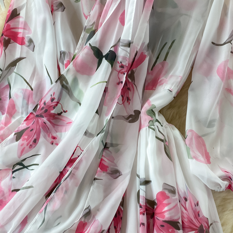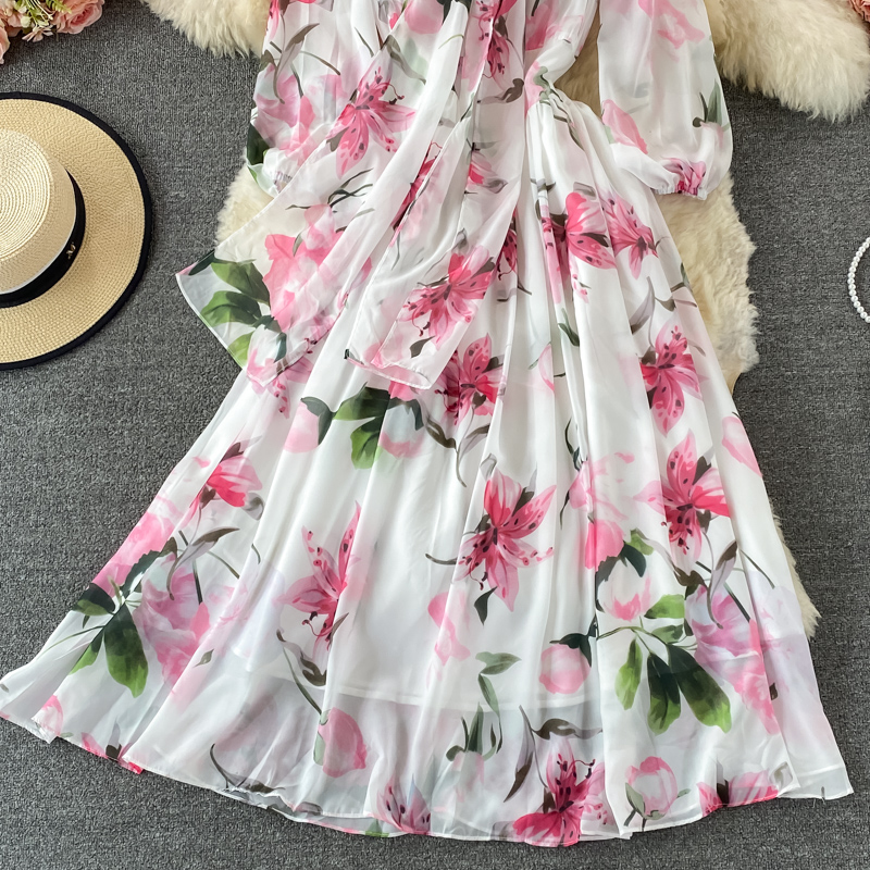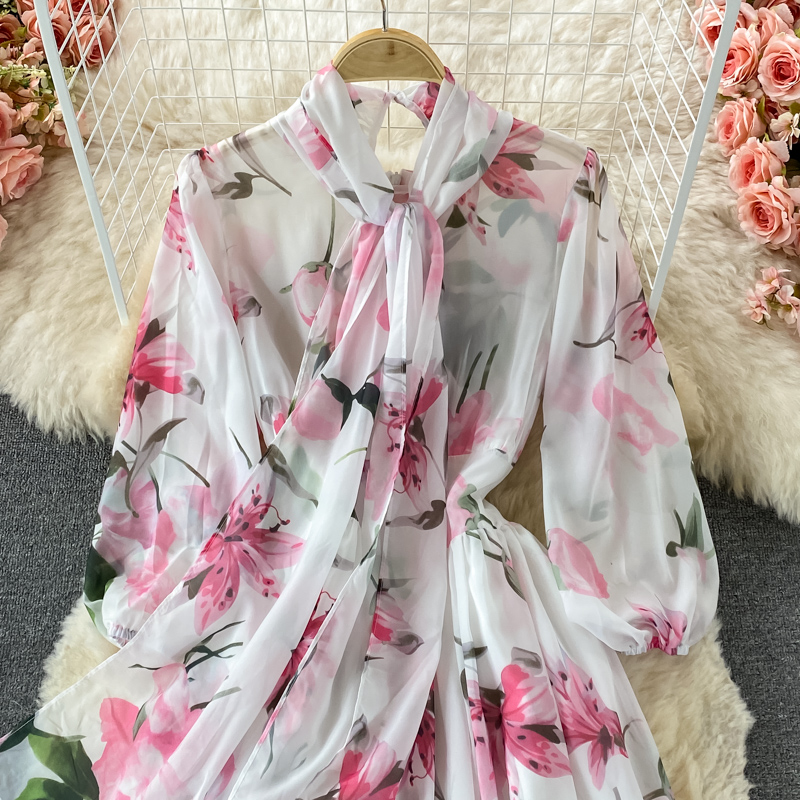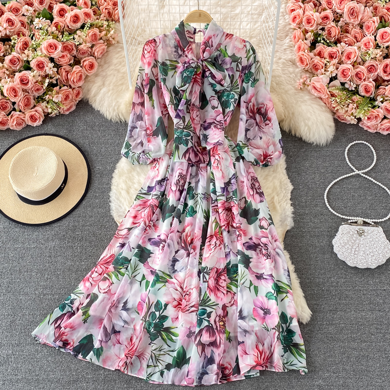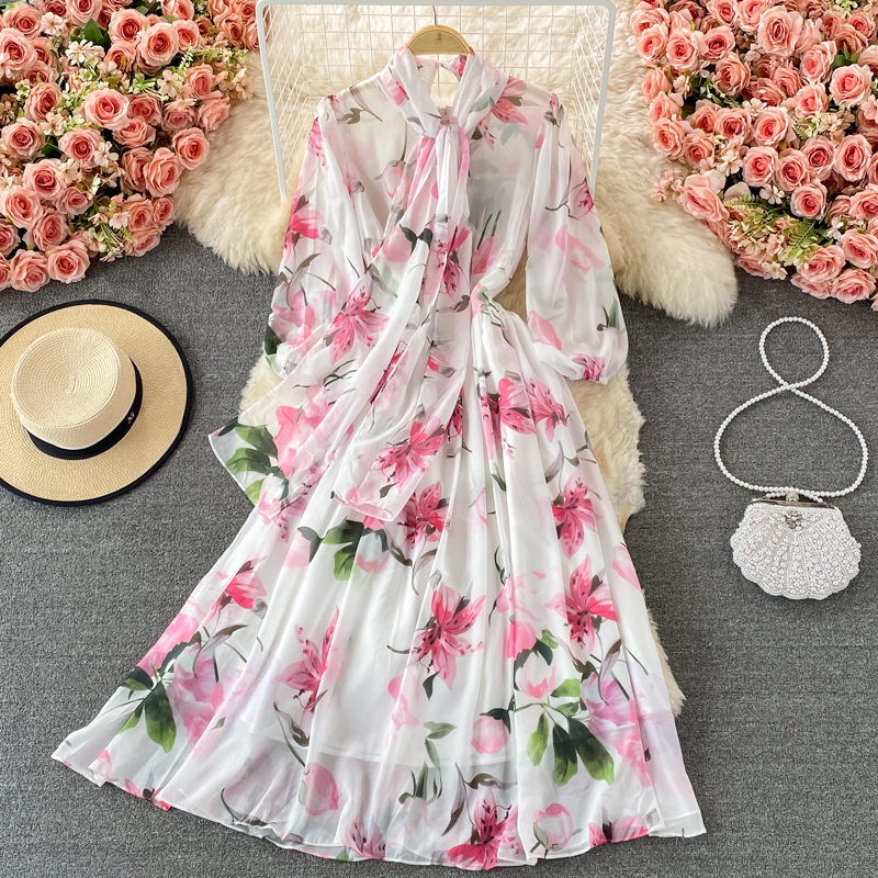 Bohemian Floral Long Dress For Women Spring Autumn Bow Collar Long Sleeve A-Line Printed Maxi Robe Female Elegant Vestidos