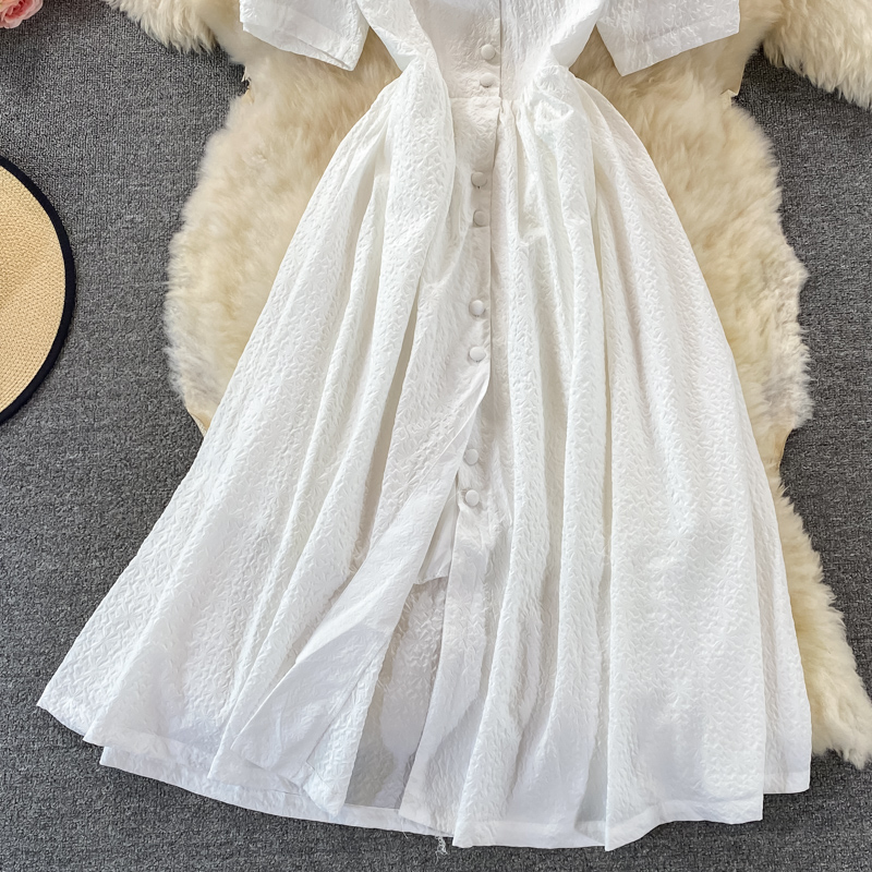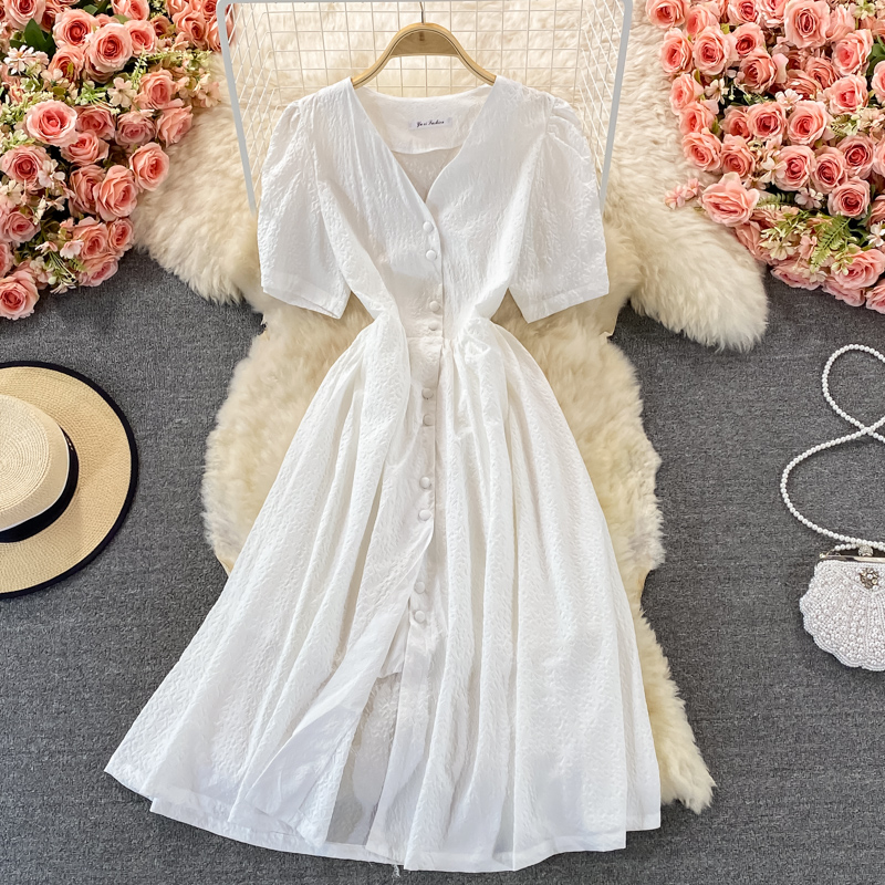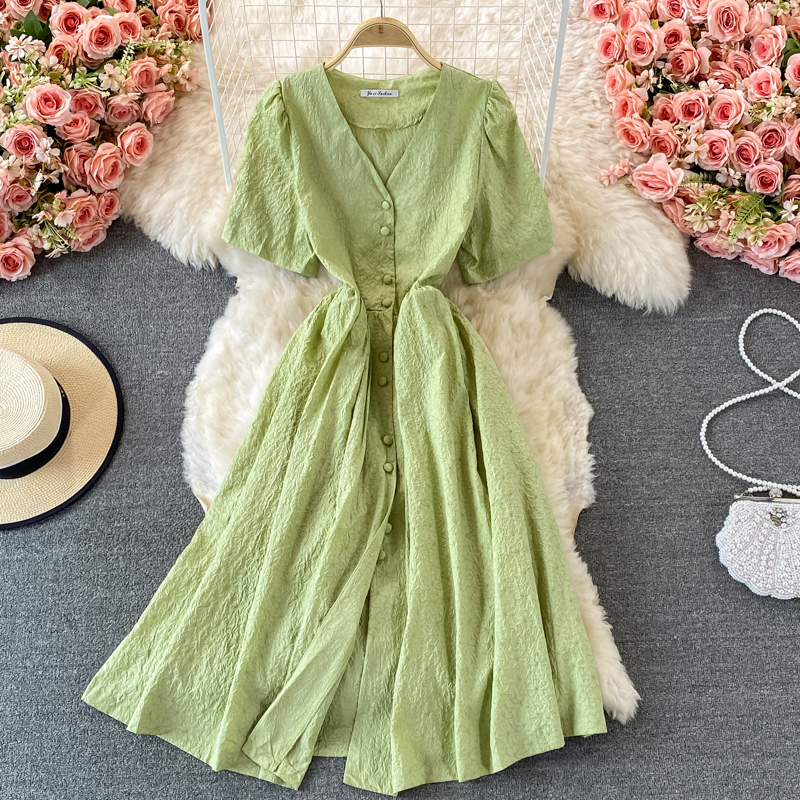 Summer Vintage Green/White Dress For Women Sweet V-Neck Single Breasted Short Sleeve Vestidos Casual Female Robe Fashion