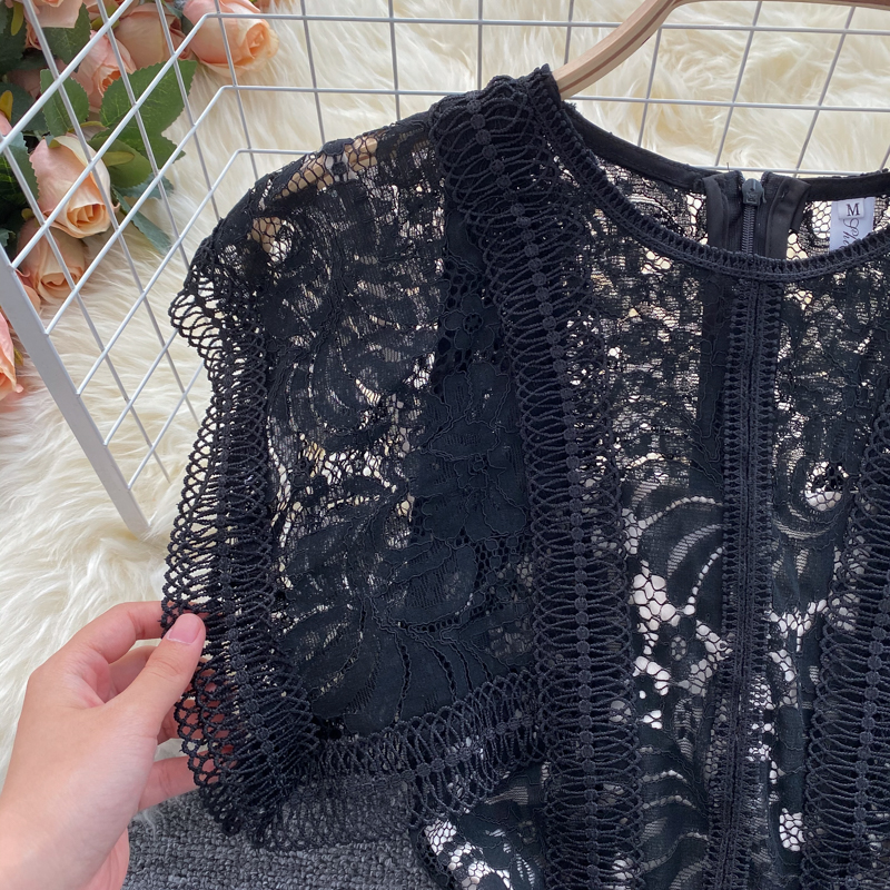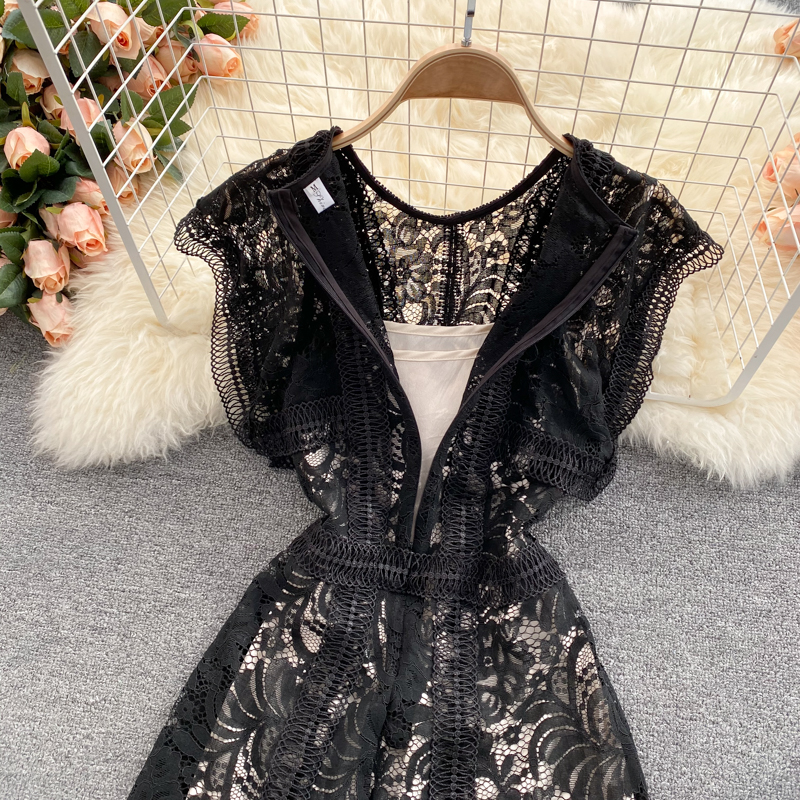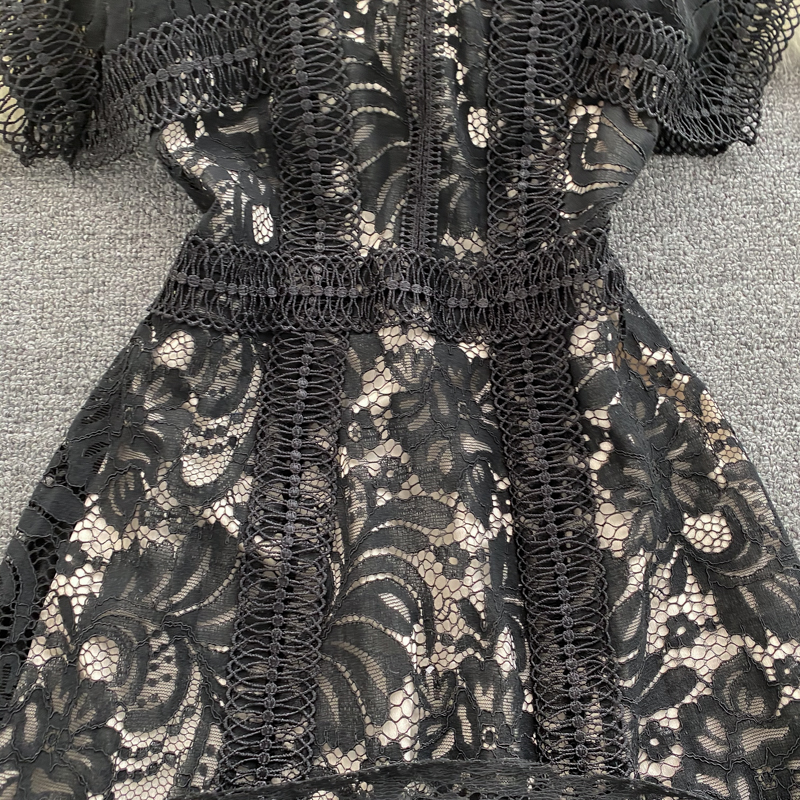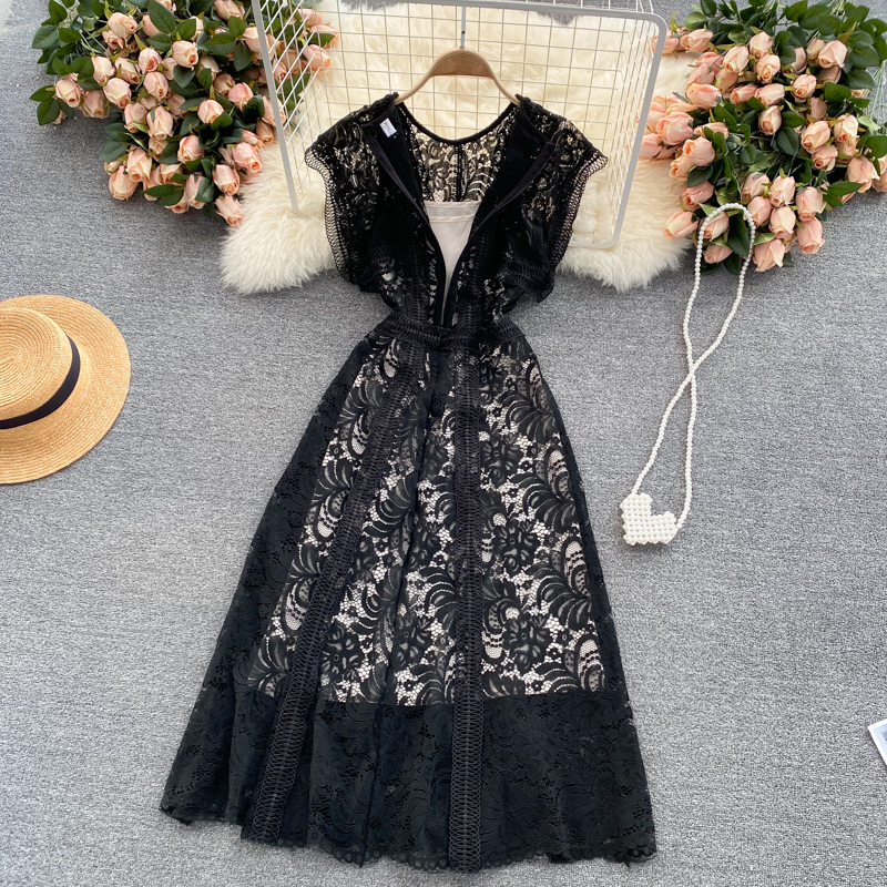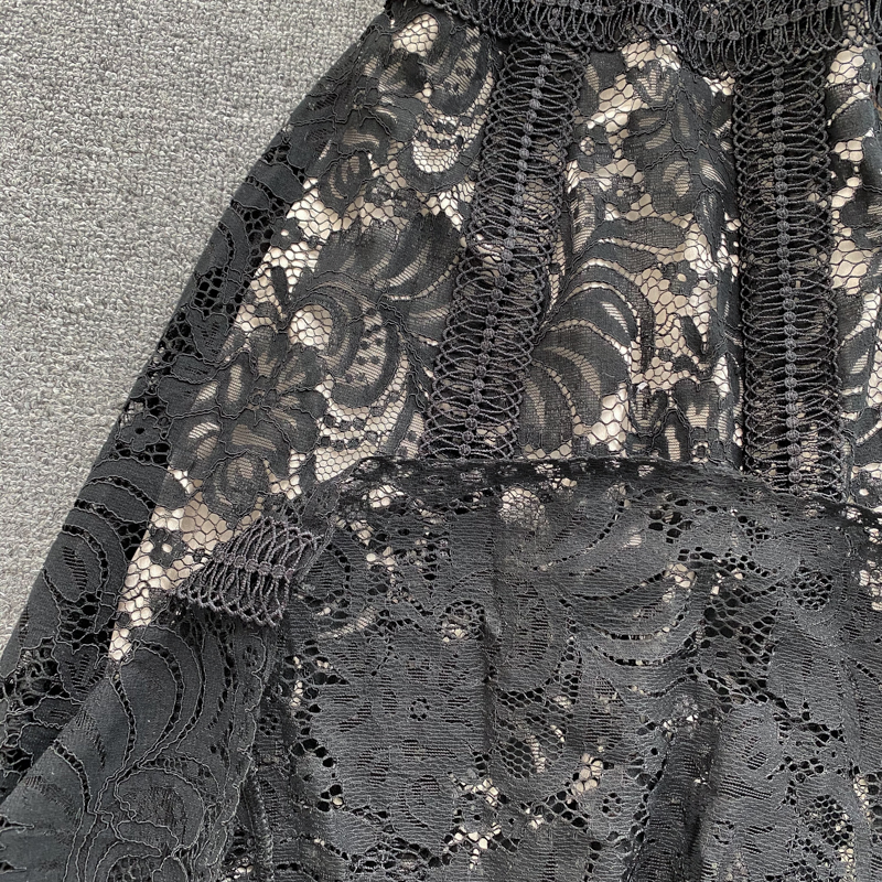 Women Black Lace Midi Dress Summer Vintage O-Neck Hollow Out Sleeveless High Waist Party Vestidos Elegant Female Robe New