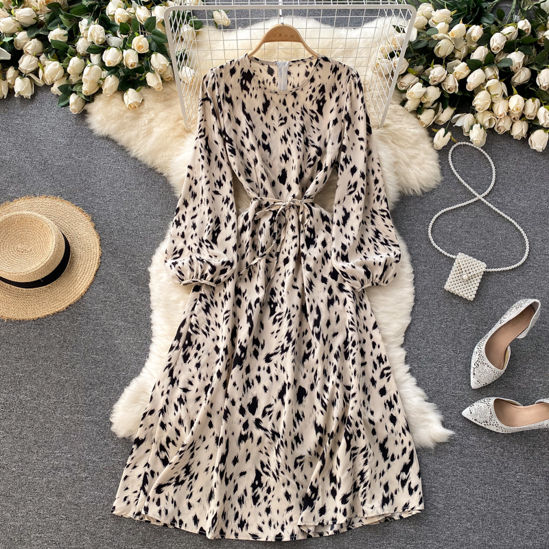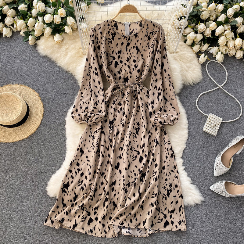 Cheap Dresses, Buy Quality Women’s Clothing Directly from China Suppliers:Women Khaki/Beige Leopard Midi Dress Spring Autumn Vintage Round Neck Puff Long Sleeve High Waist A Line Casual Vestido New