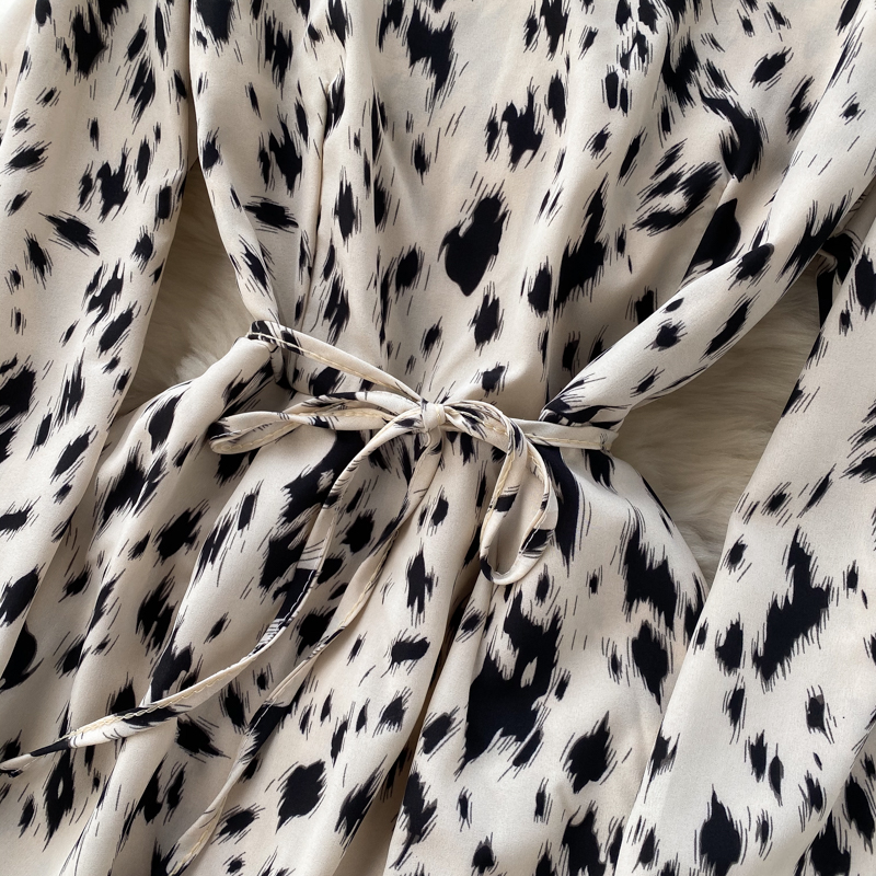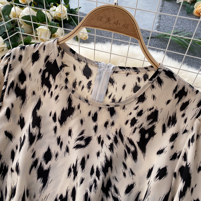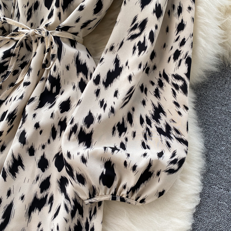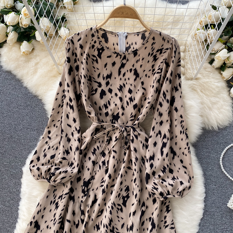 Women Khaki/Beige Leopard Midi Dress Spring Autumn Vintage Round Neck Puff Long Sleeve High Waist A-Line Casual Vestido New