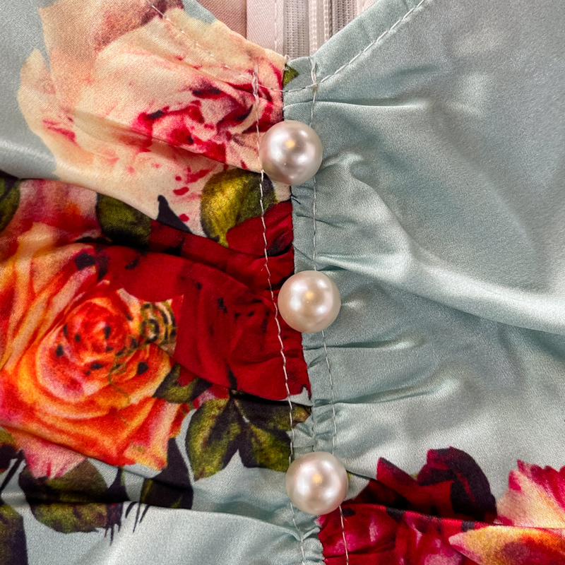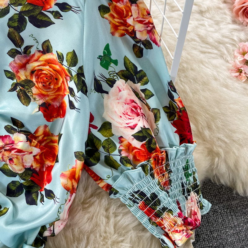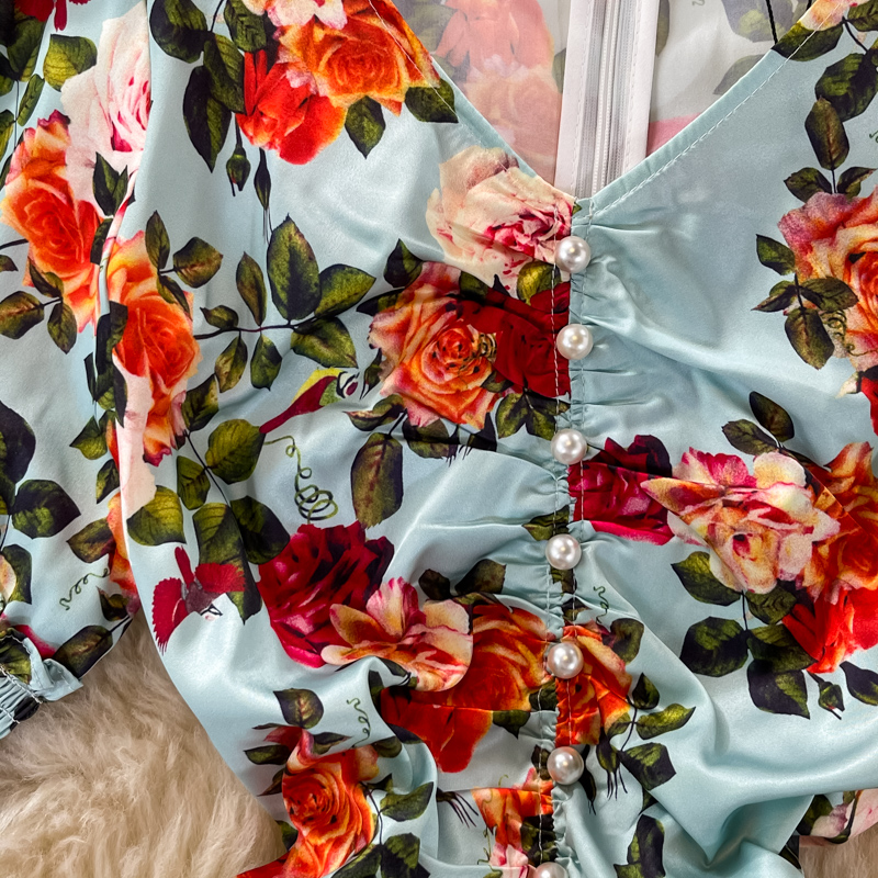 Summer Women Floral Dress Vintage V-Neck Short Puff Sleeve High Waist Ruffle Mermaid Vestidos Elegant Party Robe Female New